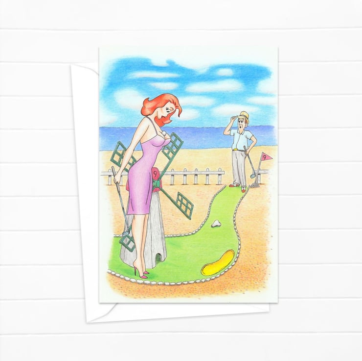 An original art greeting card with a hand-drawn pencil illustration of a crazy golf game by the sea, hand drawn in black ink and coloured pencils.