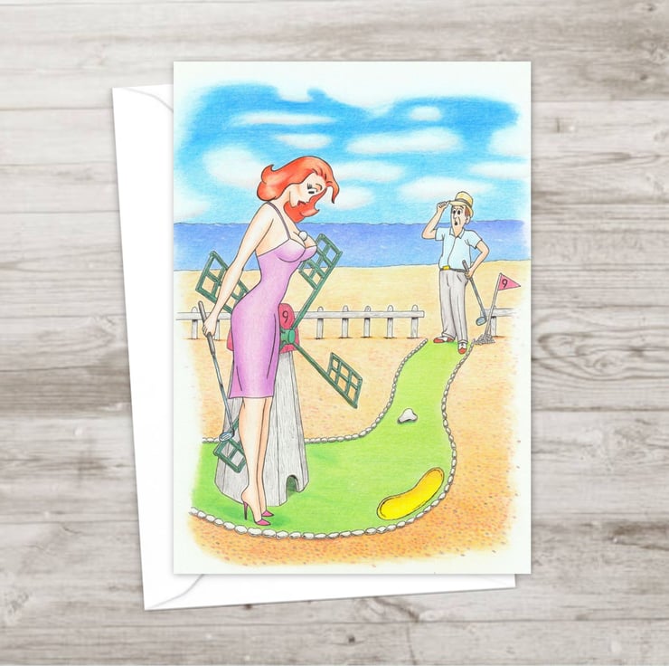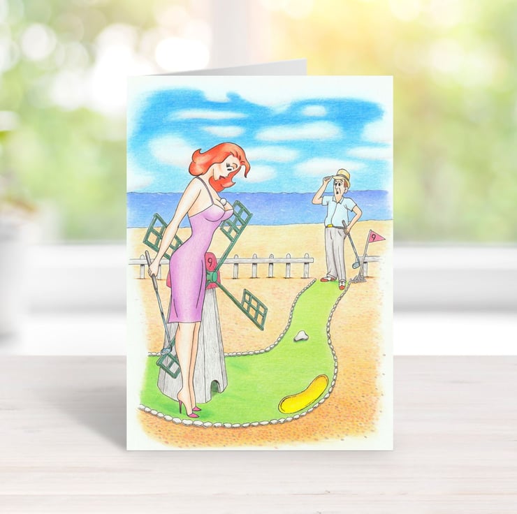 An original art greeting card with a hand-drawn pencil illustration of a crazy golf game by the sea, hand drawn in black ink and coloured pencils.