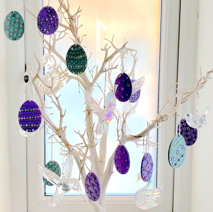 The size of each hanging Easter egg is c7cm by 5cm, plus additional length of slim satin ribbon. Each wooden Easter egg has been rustically hand painted with several layers of acrylic paint, then heavily decorated with glitters and faux jewels, giving it a gorgeous sparkling appearance. The reverse of the egg is painted plain in a matching colour.