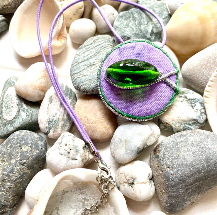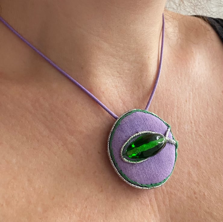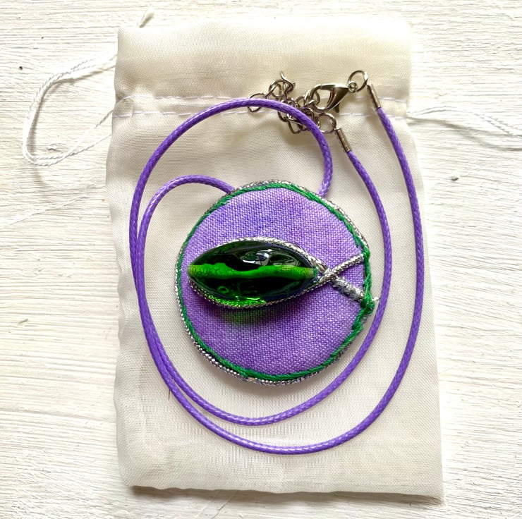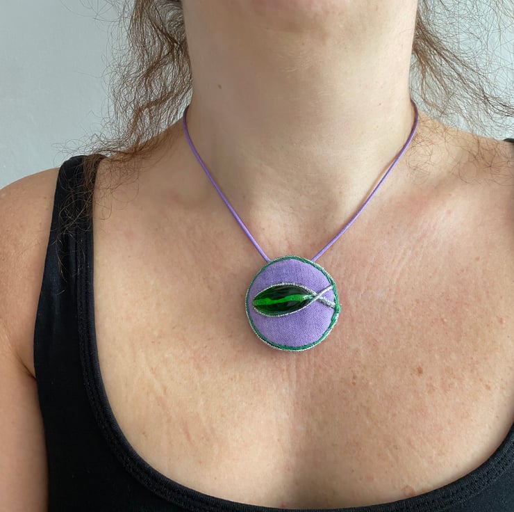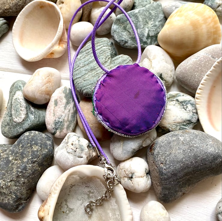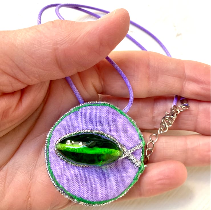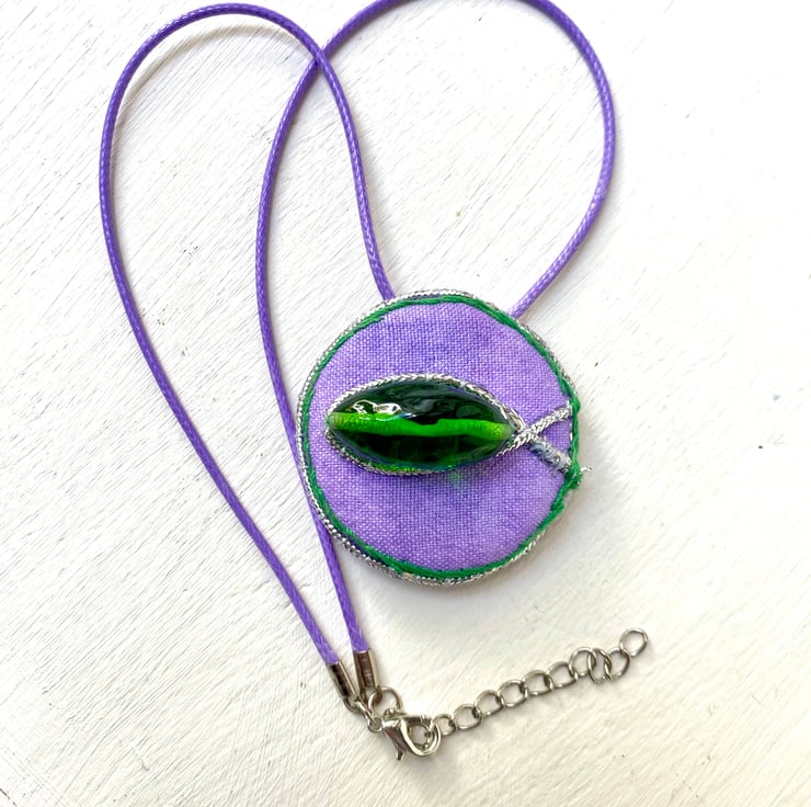 I’ve hand couched silver braid around a vintage bead to form the shape of a fish. The fabric is a beautiful mauve cotton that has been recycled.