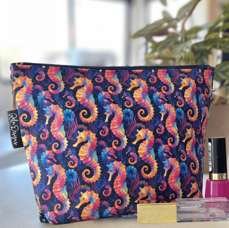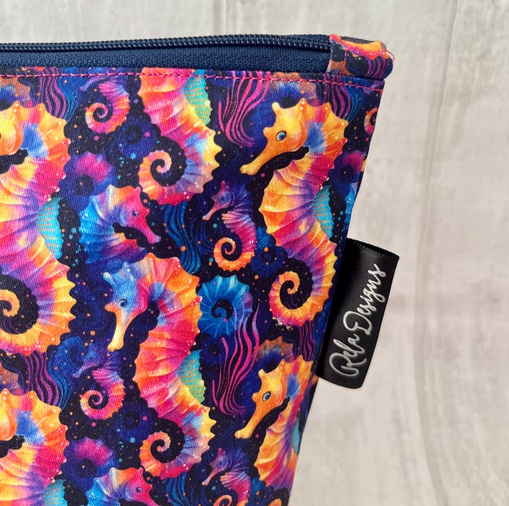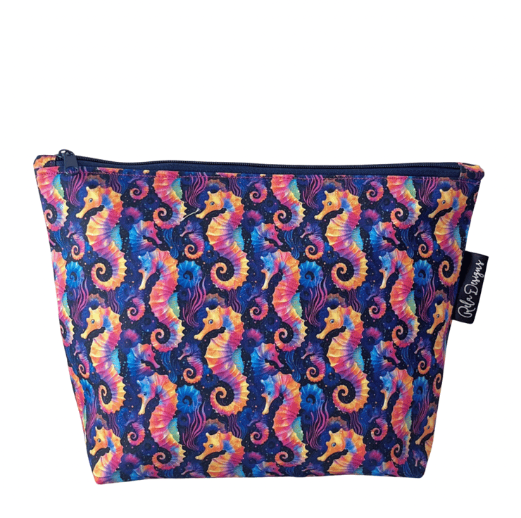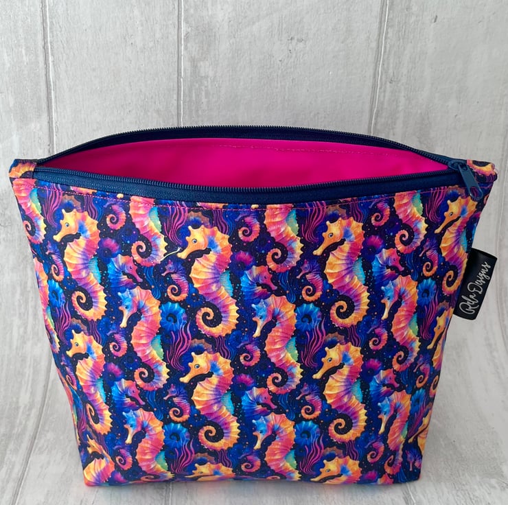 This colourful seahorse print makeup bag is made from 100% cotton and lined with a pink waterproof nylon, great for those inevitable spills.