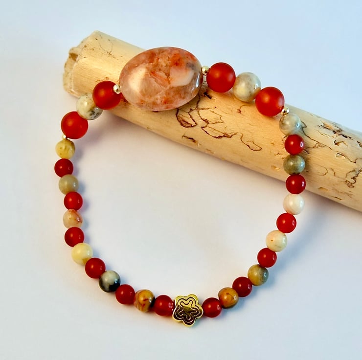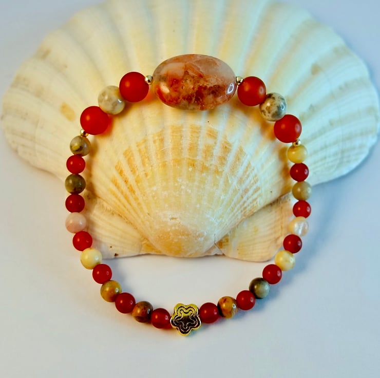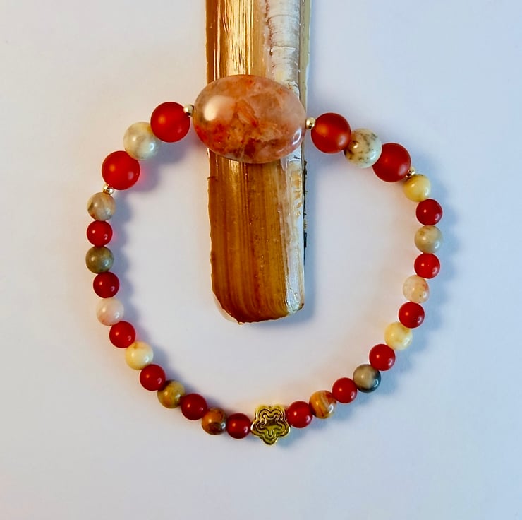 The circle graduates to alternating 4mm Crazy Lace Agate and frosted Carnelian rounds, embellished with a 7mm golden star bead.