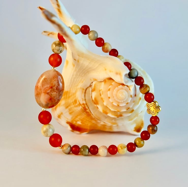 The soft, matt, burnt-orange Carnelian beads complement the colours of the Agate.