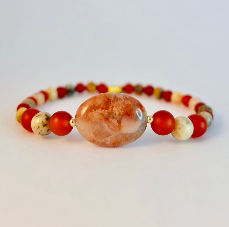 The oval focal bead is highlighted with tiny 2mm gold vermeil spacers and a trio of 6mm frosted Carnelian and Crazy Lace Agate.