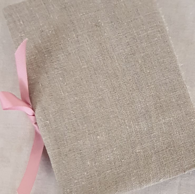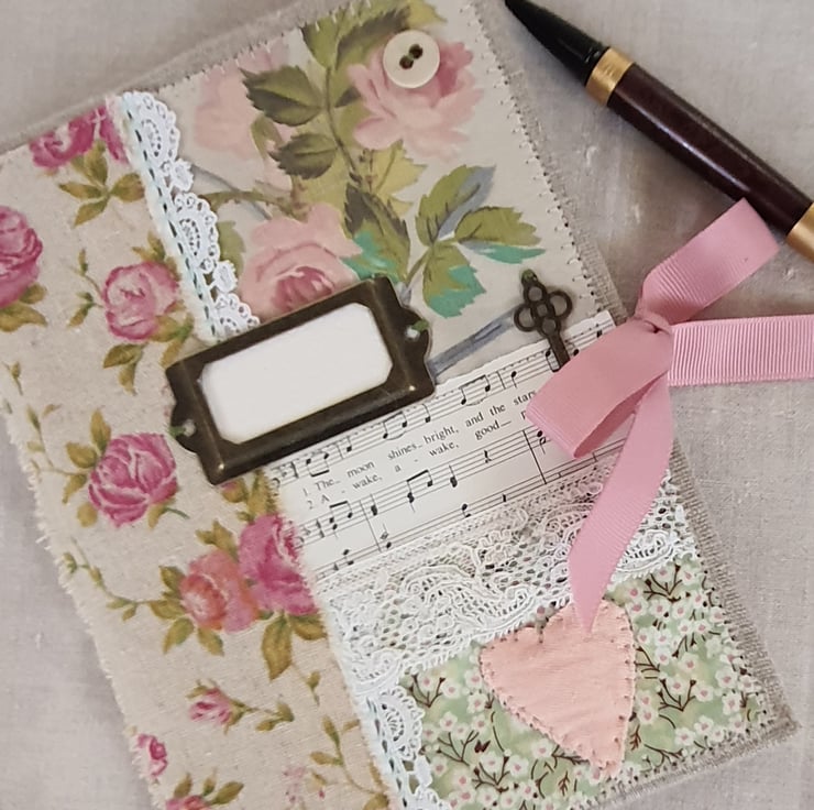 This A5 sized journal is covered with a handmade natural linen cover, embellished with pretty floral fabric, lace, vintage sheet music, a quilt heart, vintage button and a little key. It has a blank label for you to complete and ties with a pink grosgrain ribbon.
