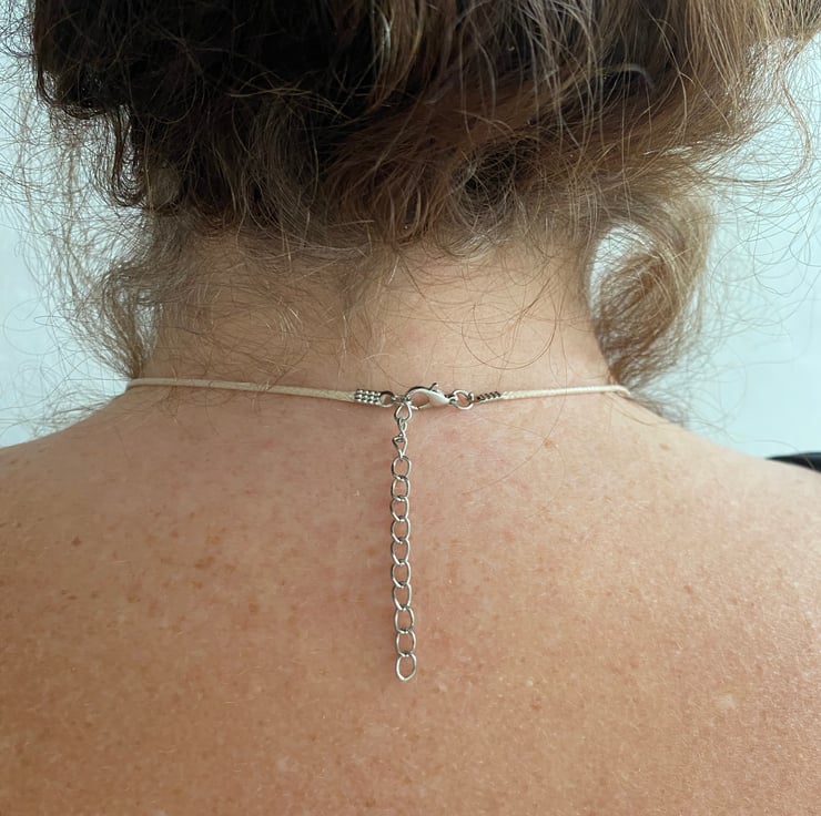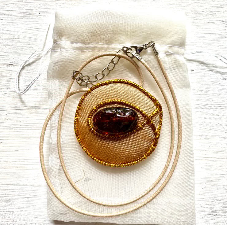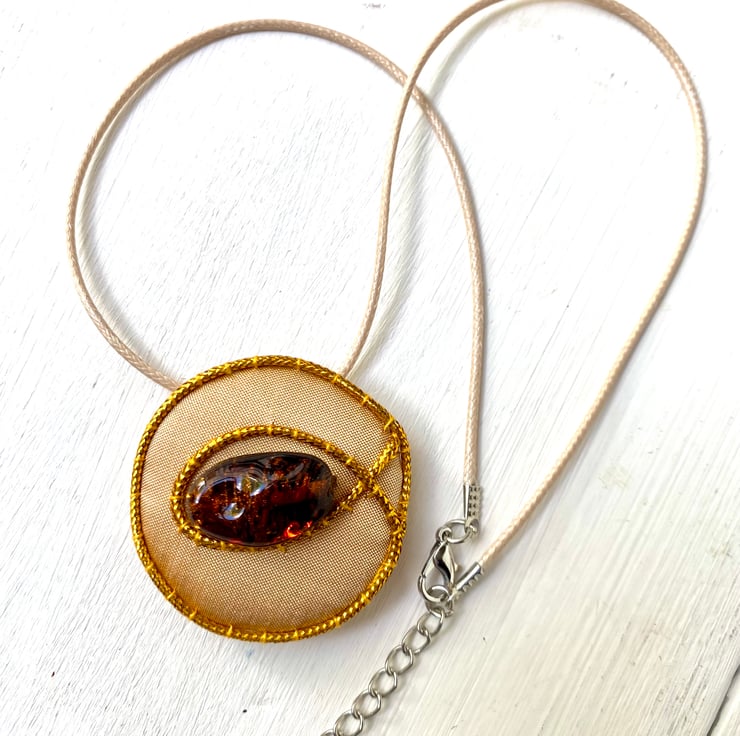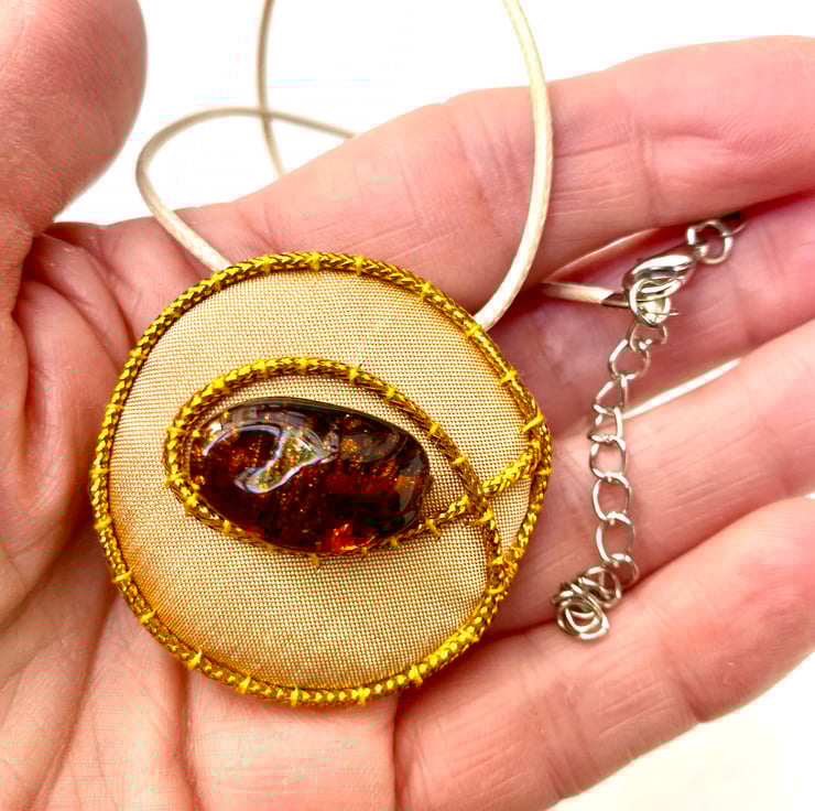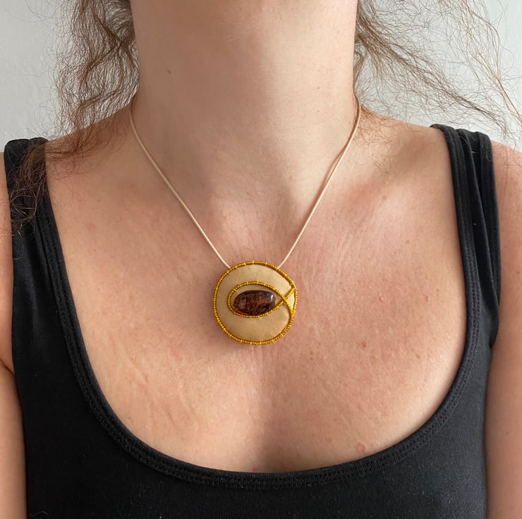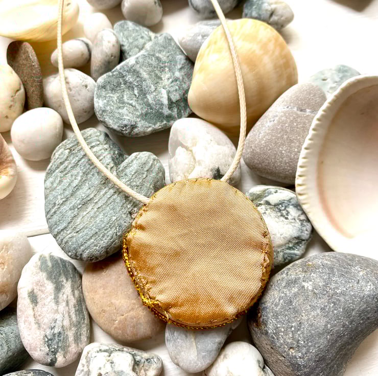 I’ve created the sign of the fish by couching (hand stitching) gold braid around a repurposed amber brown bead. The fabric is stretched around a recycled plastic disc making it an environmentally conscious piece of work. The pendant hangs on a clasp fastening cord.