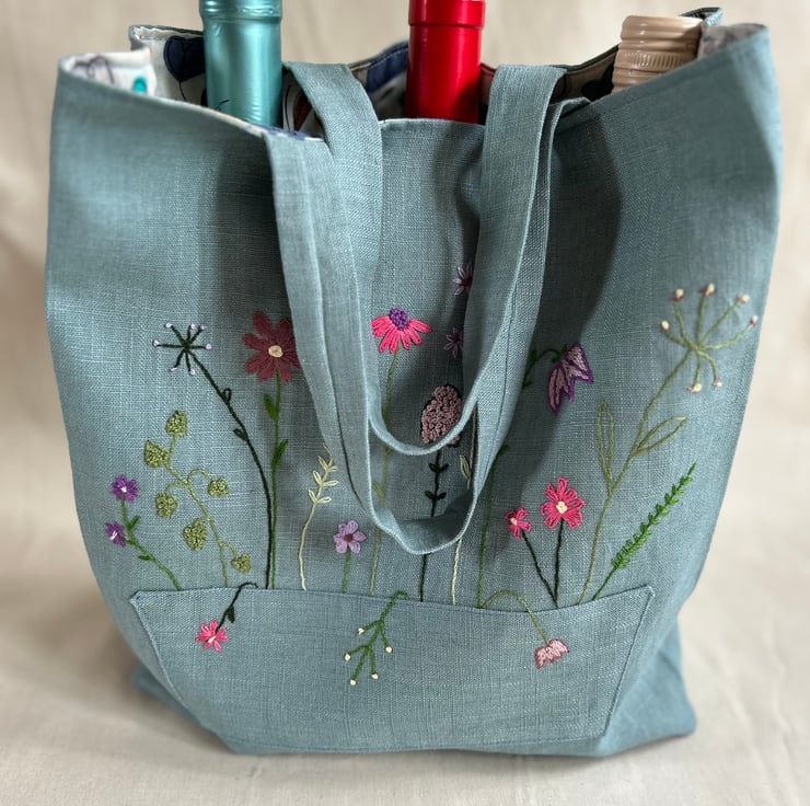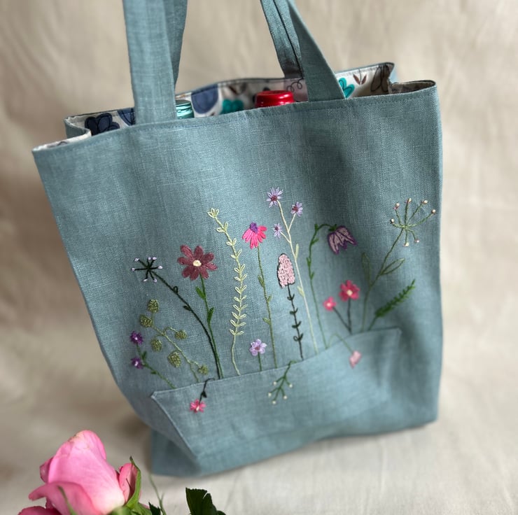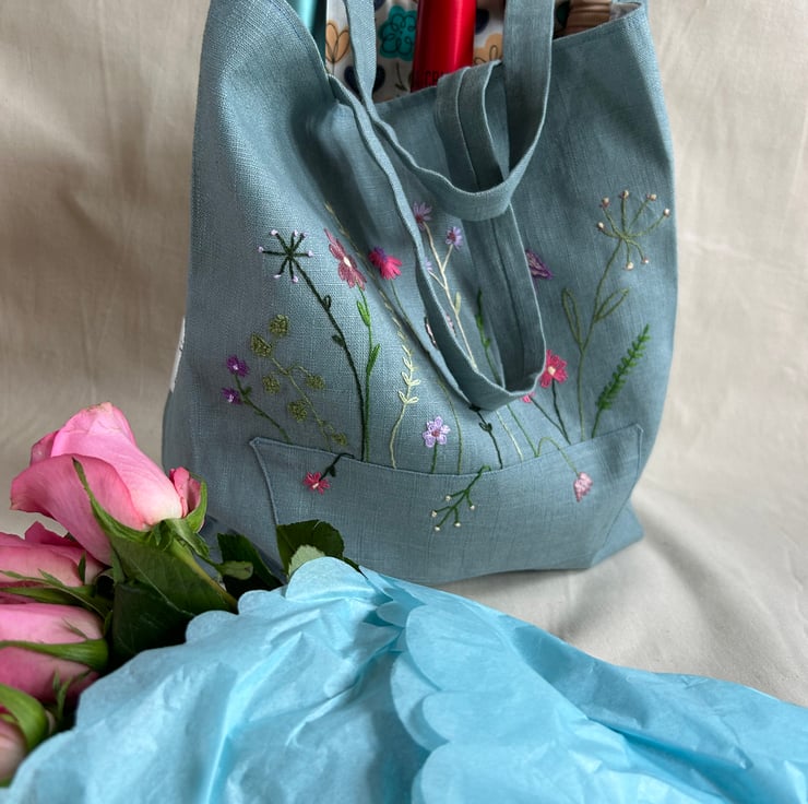 I have made this hand embroidered pale blue linen bag with pinks and greens embroidery threads and created a separately appliquéd basket with trailing flowers.