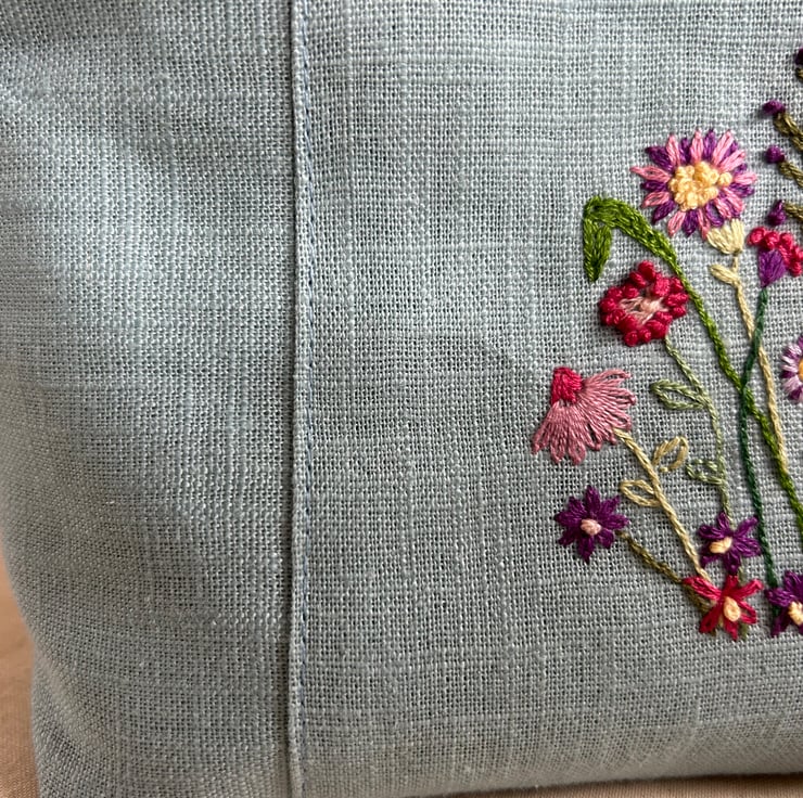 I have made this make up bag from blue linen fabric, all my friends have been delighted to receive these bags and tell me they are the perfect size. My make up bags were previously decorated with appliqué, but now these are embroidered, they are unique and there will not be another like it!