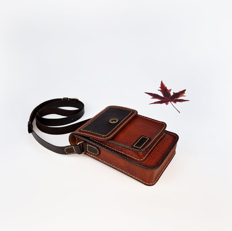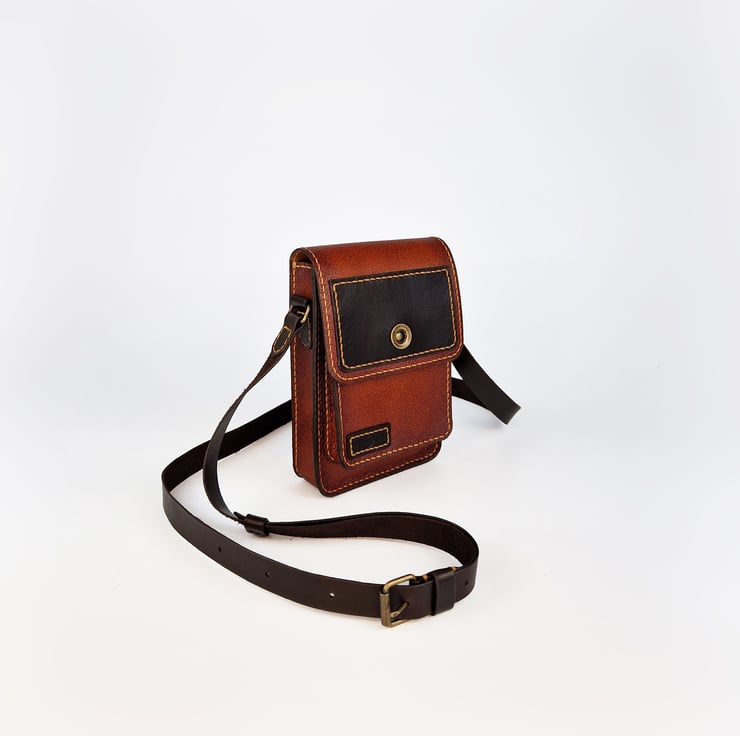 The stylish Leather Phone Bag is a compact and trendy accessory perfect for carrying your mobile phone and small essentials. Handmade from genuine leather two colours with antique brass hardware, this bag has a specially created vintage effect that adds a touch of elegance to any outfit. Ideal for everyday use.