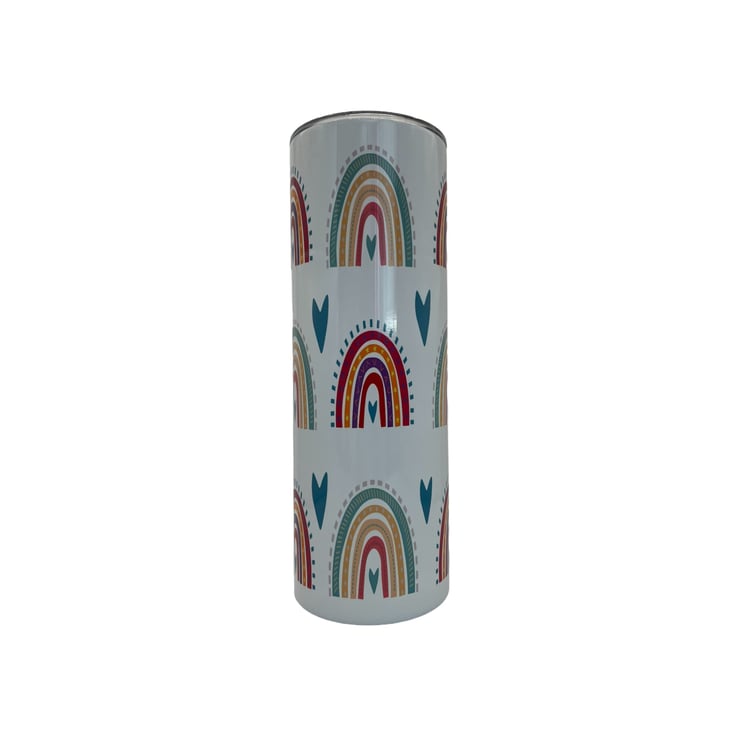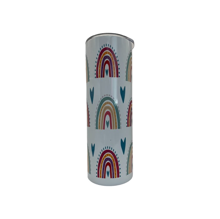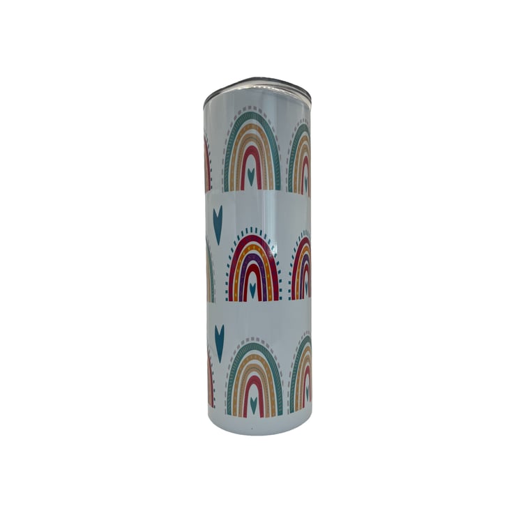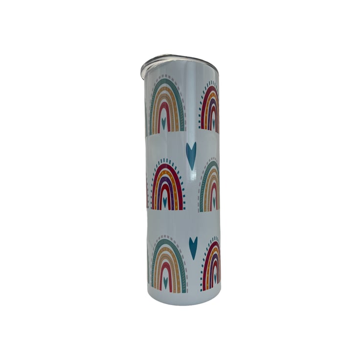 This multicoloured rainbow and heart water bottle with a lid and straw is not only stylish but also functional. The vibrant colours combined with the crisp white background creates a striking contrast that is sure to catch the eye of anyone who sees it.