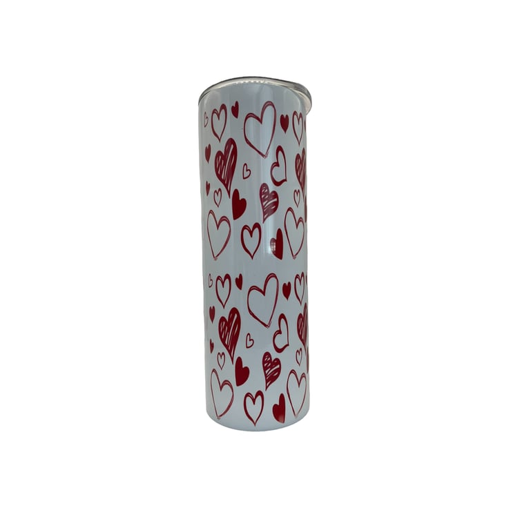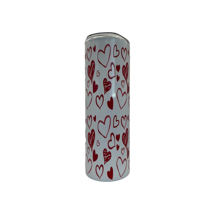 This white and red heart water bottle with a lid and straw is not only stylish but also functional. The vibrant red colour combined with the crisp white background creates a striking contrast that is sure to catch the eye of anyone who sees it.
