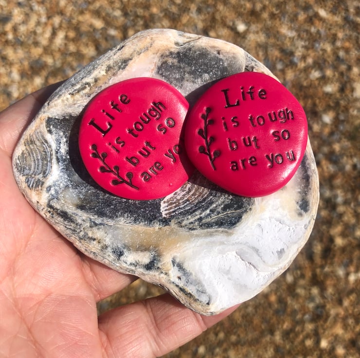 As a primary school art teacher, I know that words have the power to build and encourage and I get to see the joy of word spoken light up a little face. I started making these polymer pebbles as flower designs on cards, but was quickly asked to make these as pebbles that could be held and treasured. Words were then added to produce the designs you see before you.