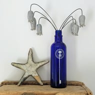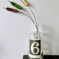 The glass shapes are cut entirely freehand (no templates) to replicate the variation seen in nature; as such your decorations may differ very slightly from the photos shown here. The solder around the glass has a black patina, and the wire rings have a variegated gun-metal patina.