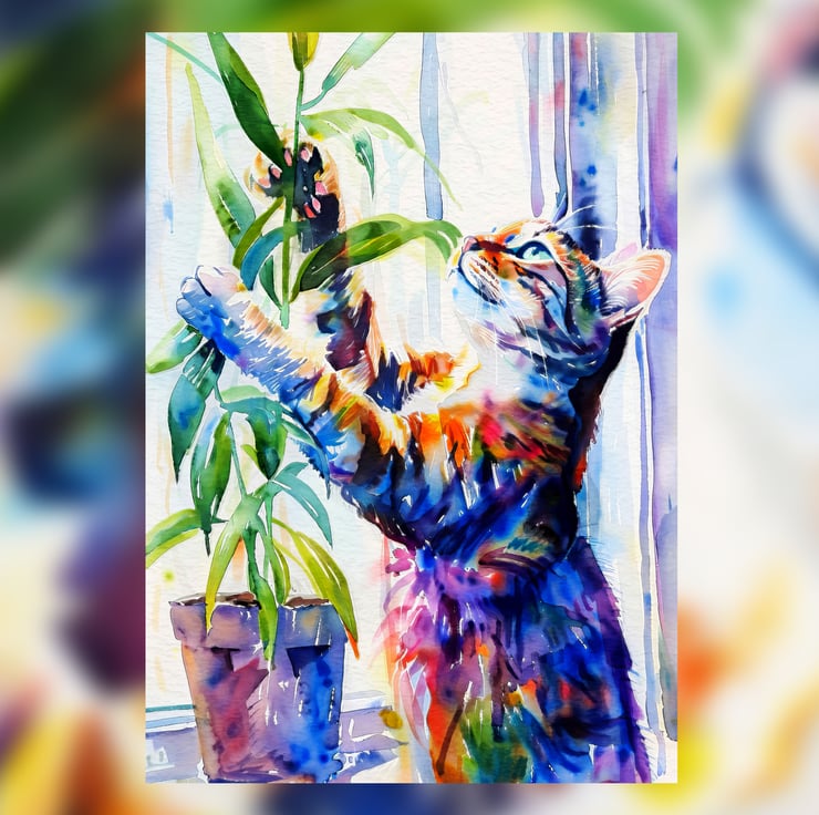 Meet the “Playful Kitten with Plant,” a delightful watercolor painting that captures a curious kitten reaching for a leafy green plant. Moreover, the vibrant colors used in this artwork bring the scene to life, highlighting the kitten’s playful nature and the lush green leaves of the plant. The artist has skillfully blended bright hues to create a lively and energetic atmosphere.