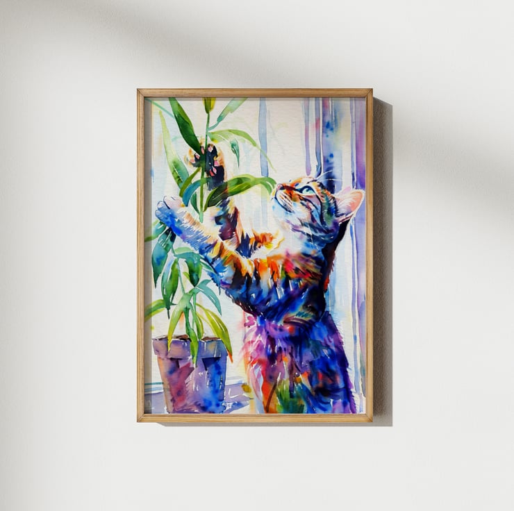 Moreover, the high-quality print ensures that every detail, from the delicate leaves of the plant to the kitten’s fur, is captured with precision. This piece is a testament to the artist’s ability to blend colors seamlessly and create a visually engaging composition.