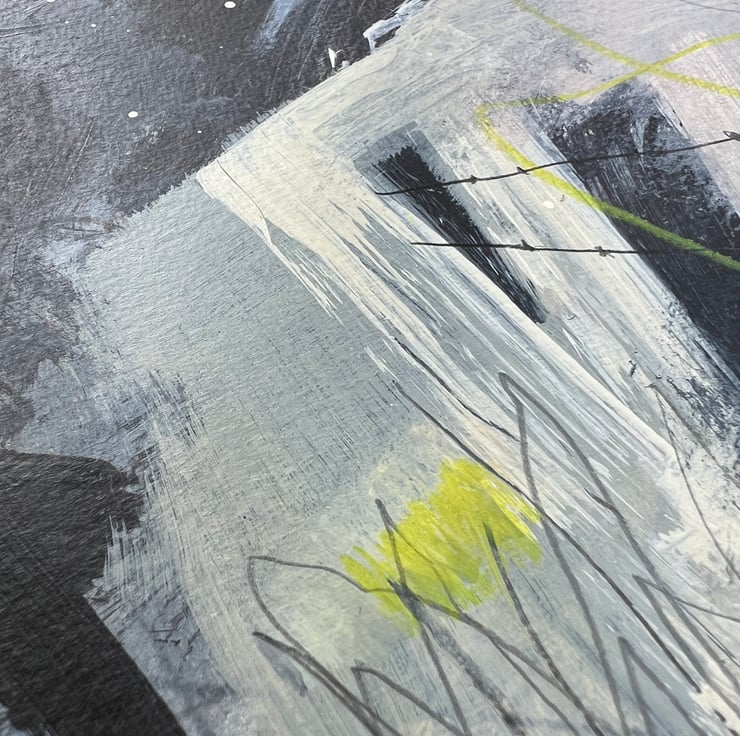 Unframed semi-abstract landscape painting inspired by the wild moorlands of the Peak District National Park. Painted in acrylic and mixed media (various pencils and pastels) on 300gsm paper.