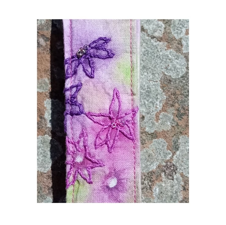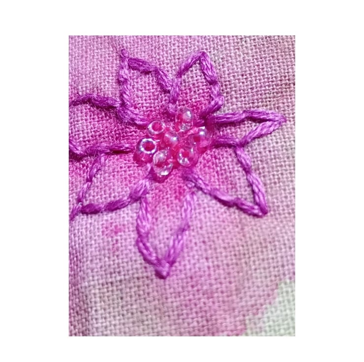 It is crafted by hand from light linen fabric. I have hand-painted and hand embroidered the fabric with cotton thread in a watercolour style. It has a mellow and gentle floral design in shades of pink, purple and green with seed beads carefully chosen and form some of the flower centres.