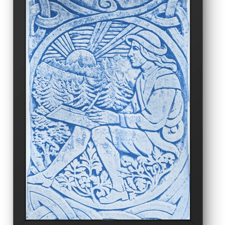 This is a cyanotype of a carving on the grave of the English writer, philosopher, art historian, art critic and polymath John Ruskin. It is situated in the churchyard of St Andrew's in Coniston, Cumbria. This carving is said to represent Ruskin's book Modern Painters.