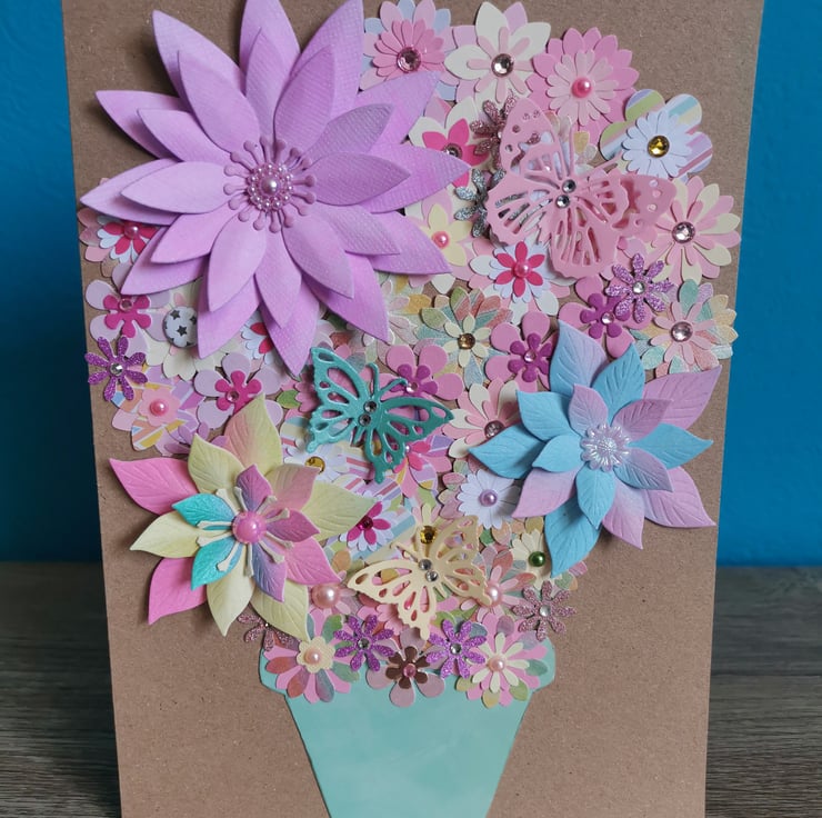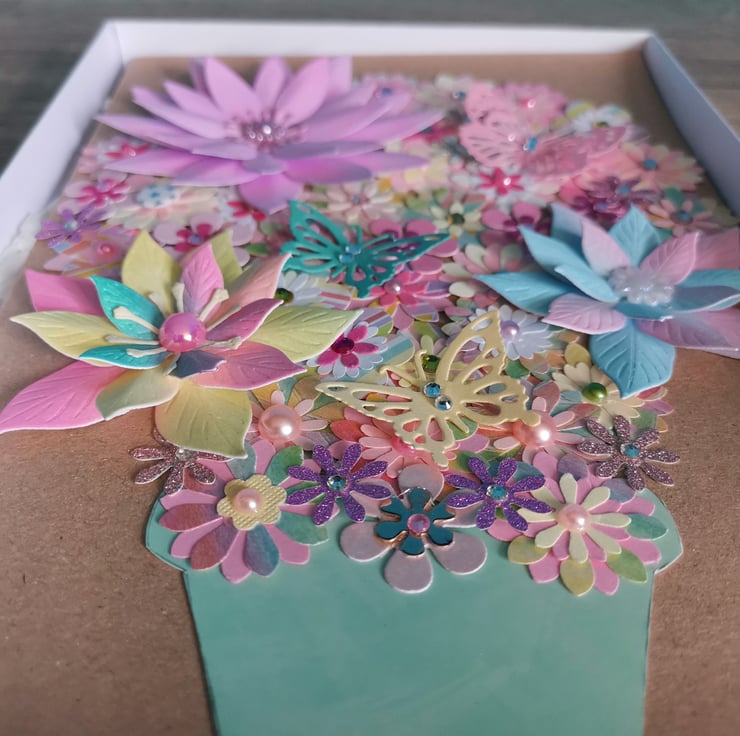 A STUNNING PASTEL COLOURS MULTICOLORED FLOWERS 3D LUXURY UNIQUE HANDMADE ONE OFF ORIGINAL KEEPSAKE CARD THAT YOU CAN ALSO PLACE IN A BOX FRAME, AND KEEP FOREVER.