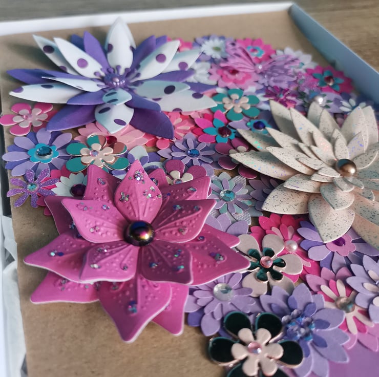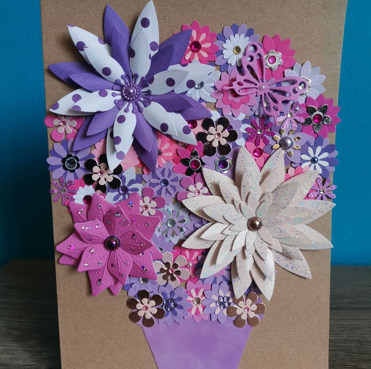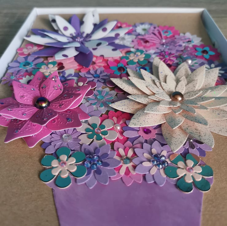 A STUNNING PURPLE AND PINK FLOWERS 3D LUXURY UNIQUE HANDMADE ONE OFF ORIGINAL KEEPSAKE CARD THAT YOU CAN ALSO PLACE IN A BOX FRAME, AND KEEP FOREVER.