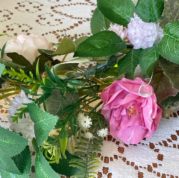A beautiful handmade artificial flower and foliage table garland. The garland measures approximately 2.1metres by approximately 22cm and is suitable for a long top table decoration, a mantle piece, or a ceremony table. It is full of many different flowers and leaves attached to a plastic multi stemmed garland base. The flowers include hydrangeas, roses, carnations, gypsophila, dahlias and more. These are surrounded with leaves and foliage of many colours and types. The garland has two strings of tiny LED lights wound through from both ends, these have clear crystals and strings of cream pearls. The lights make the garland sparkle beautifully.