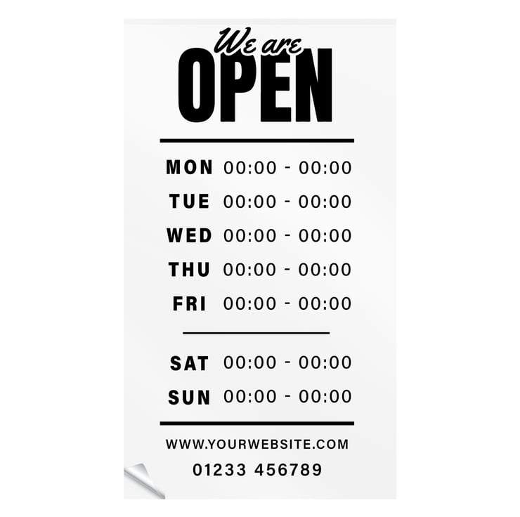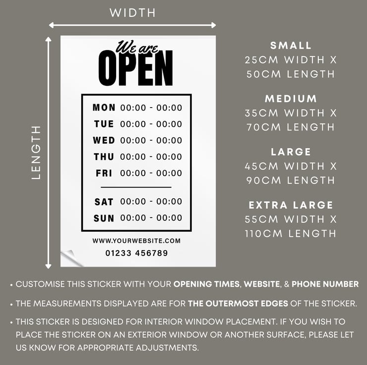 This sticker enables you to personalise the displayed opening hours, include your phone number, and input your website or social media handle. Kindly provide these details in the personalisation box.