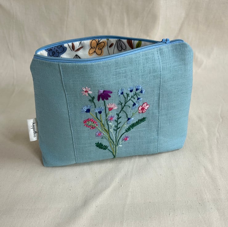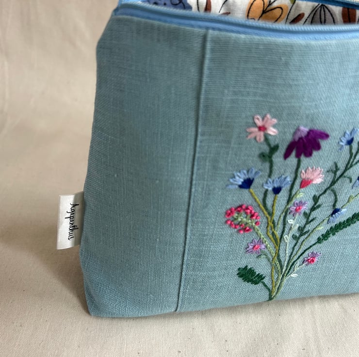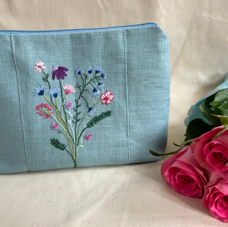 I have made this make up bag from blue linen fabric, all my friends have been delighted to receive these bags and tell me they are the perfect size. My make up bags were previously decorated with appliqué, but now these are embroidered, they are unique and there will not be another like it!