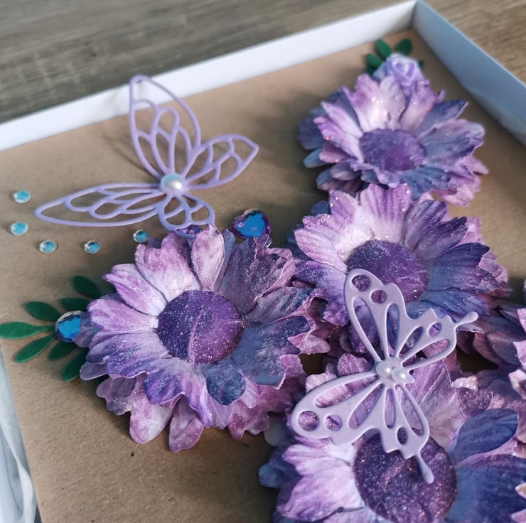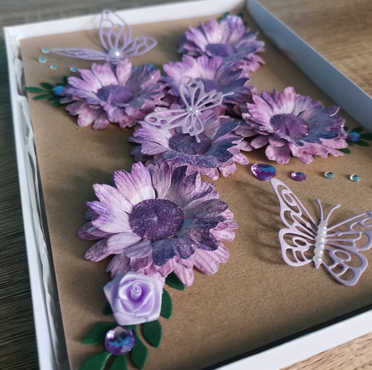 A STUNNING PURPLE FLOWERS 3D LUXURY UNIQUE HANDMADE ONE OFF ORIGINAL KEEPSAKE CARD THAT YOU CAN ALSO PLACE IN A BOX FRAME, AND KEEP FOREVER.