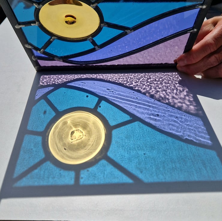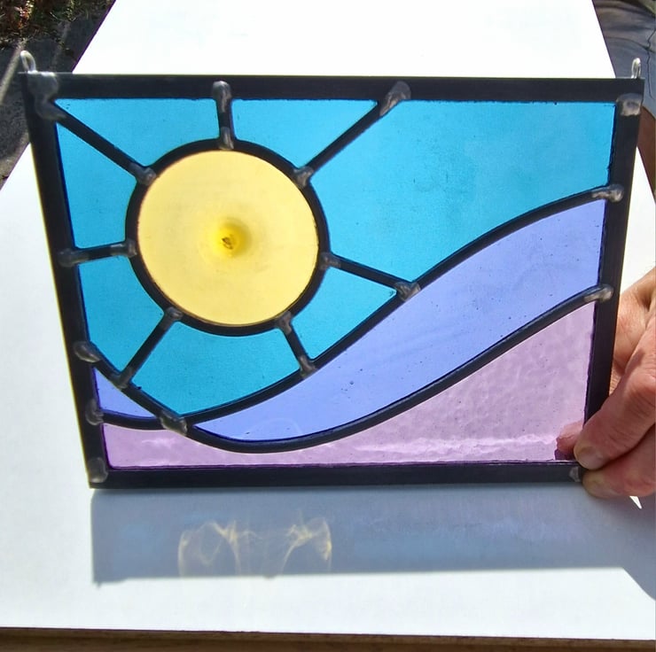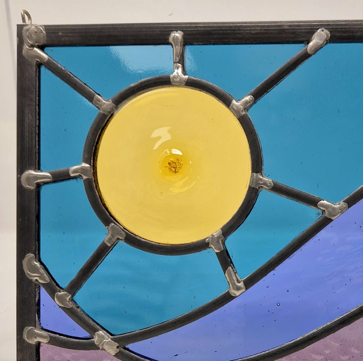 An amber hand blown glass rondel forms the big feature sunshine, visible low in a deep jade/turquoise sky over purple waves.... I'm aiming for a stormy sky over a rough ocean with a huge sunshine signalling better weather ahead.