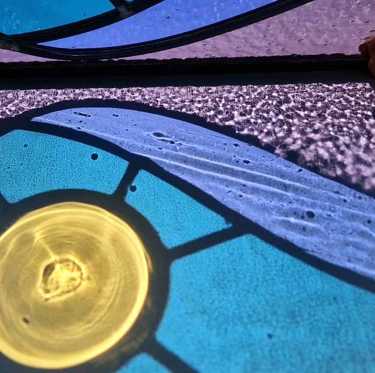 Once cut, the panel is then leaded, soldered and cemented. Hooks have been added for hanging this piece in your window.