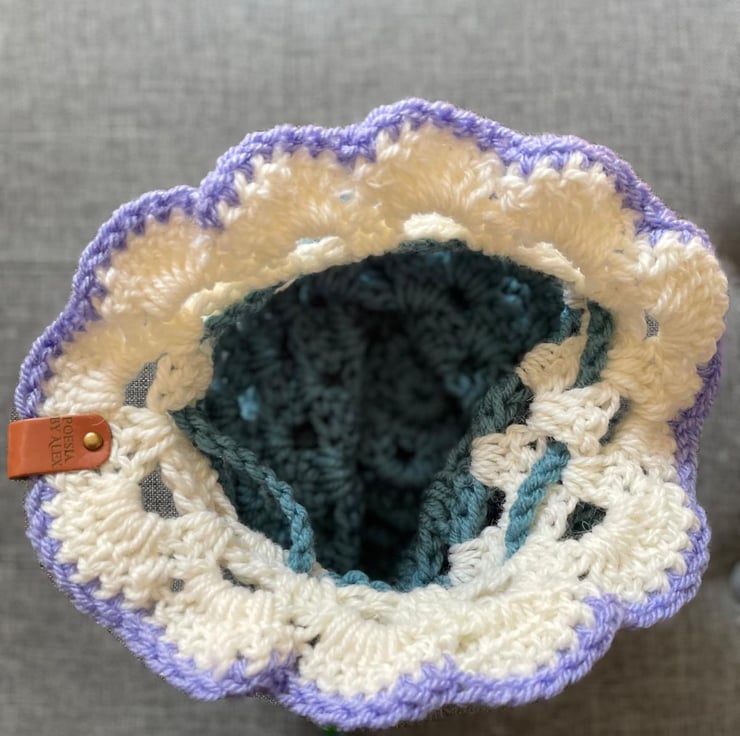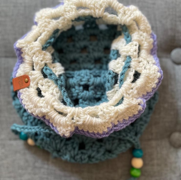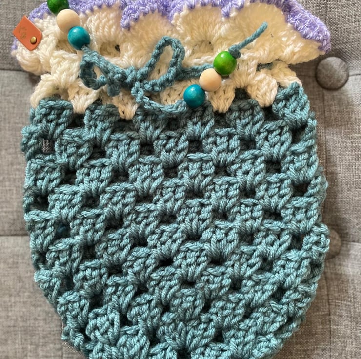 Keep your dressing table tidy with this pretty crocheted drawstring makeup bag. This pouch is larger than the others in this design, and has a pretty lilac trim. Dimensions (approx) Height: 26cm x Width: 20cm.