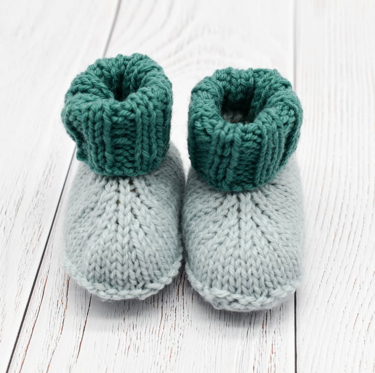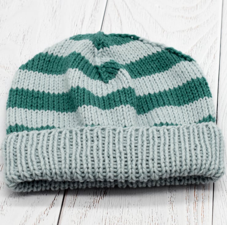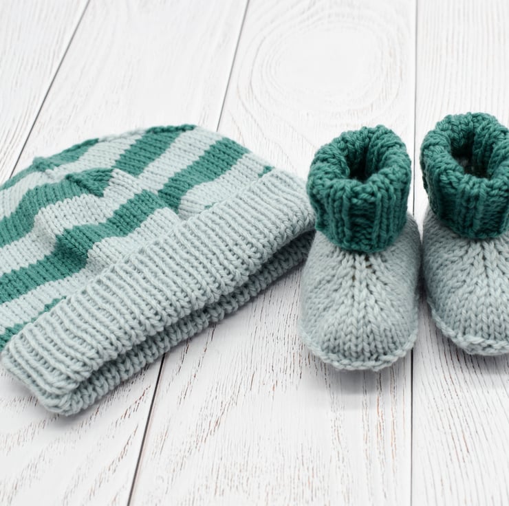 Hand knitted with unbelievably squishy Rico Baby classic dk yarn which is ideal for precious new born skin. This hat and bootie set are in complementary green and light blue. The booties are light blue with green cuffs and the beanie hat is striped with a deep brim which can be worn turned up to keep ears extra cosy.