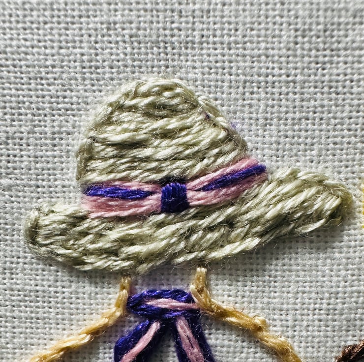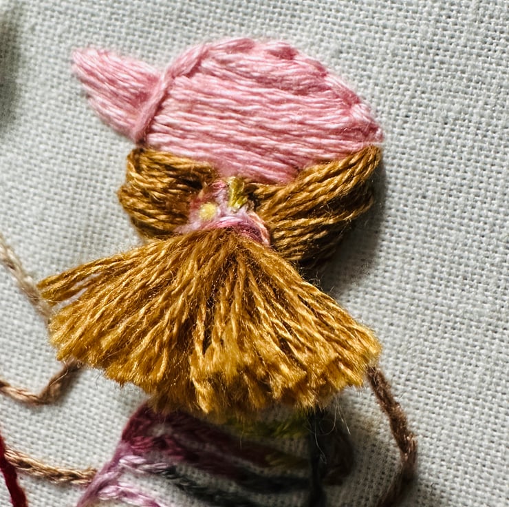Hand drawn and hand embroidered with textured details of flowing hair and straw hats. Mounted in a decorative wood effect display frame with brass hanging hoop.