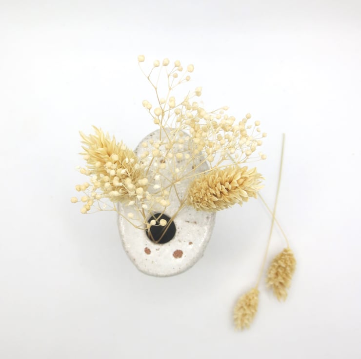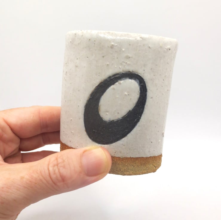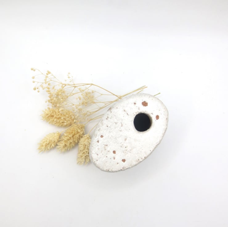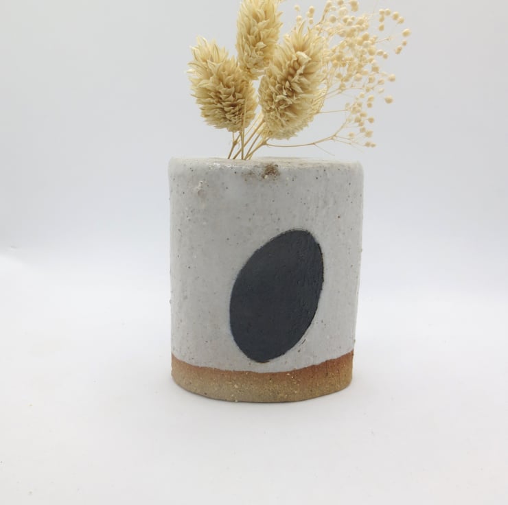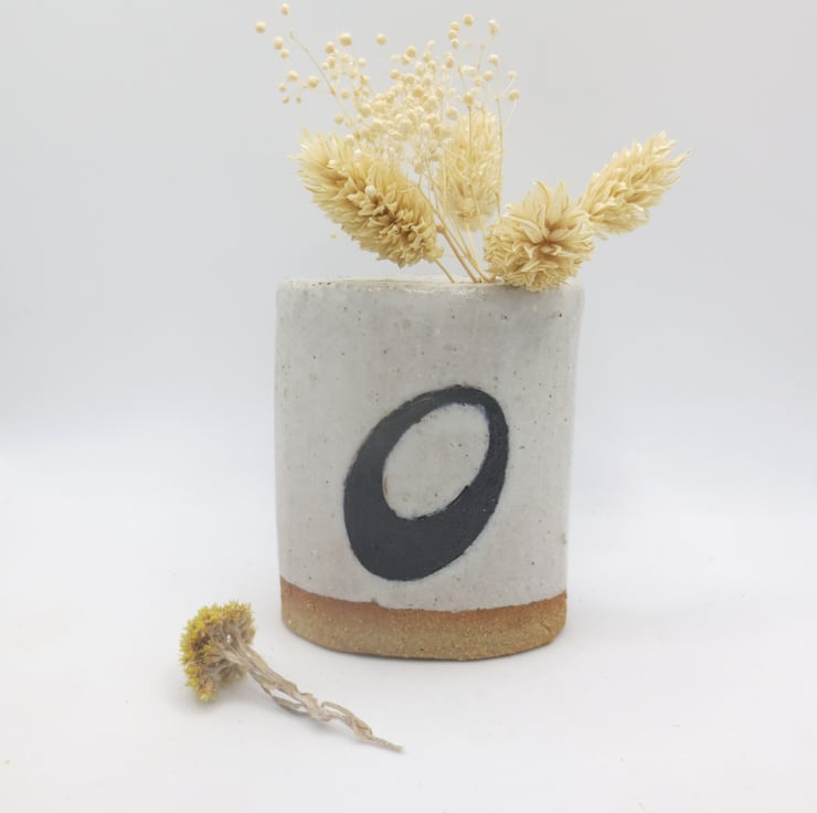A small oval bud vase, hand built from textured crank, buff coloured clay with a matt black oval motif on both sides. Fired to stoneware temperature (1280C) with a shiny white glaze. Would suit a dried flower sprig, but will hold water.