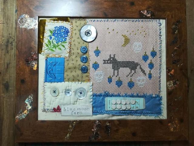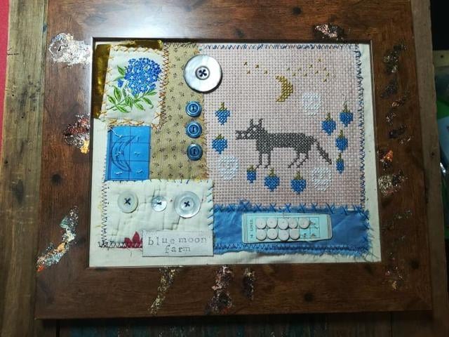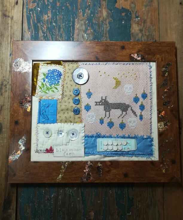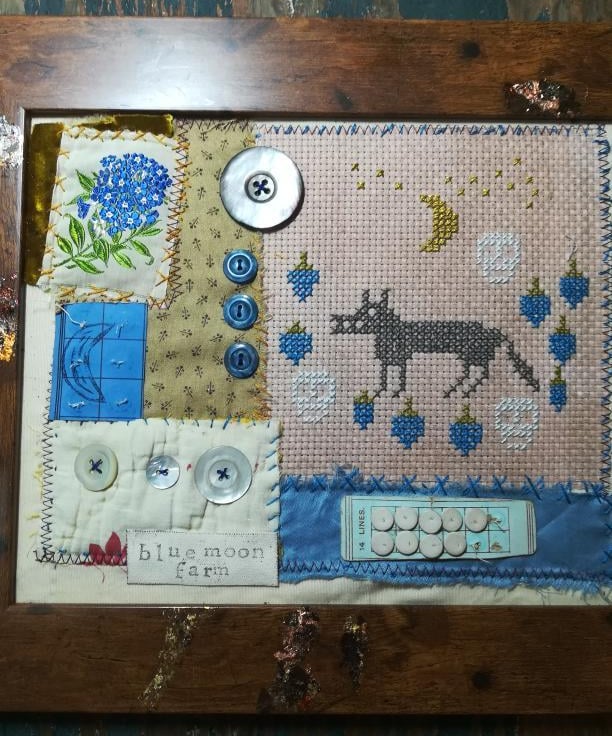 Textile Art, mixed media,cross stitch, primitive stitching, folk art hanging