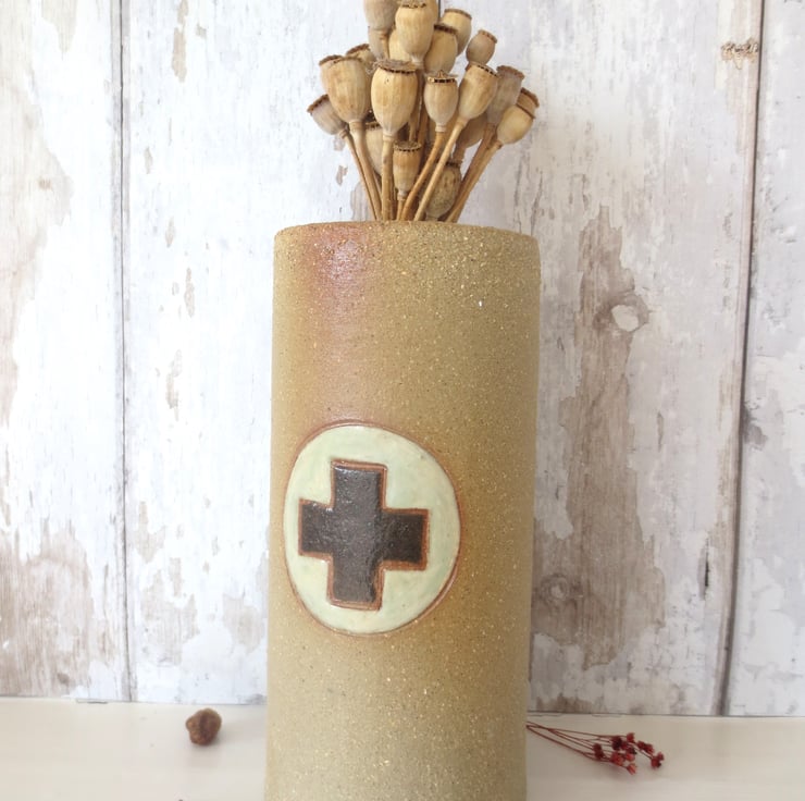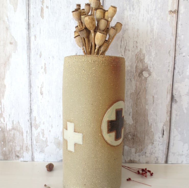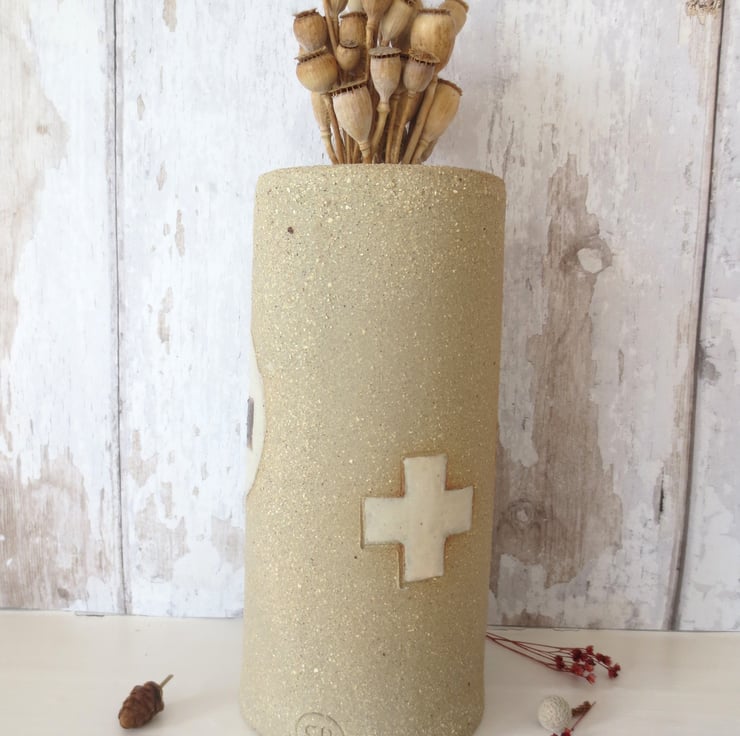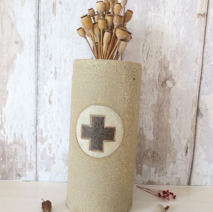 A hand built cylinder vase made from textured buff coloured clay with cross motifs in brown and white glazes. Fired to stoneware temperature (1280C). Would suit a dried flowers, but will hold 7ater.
