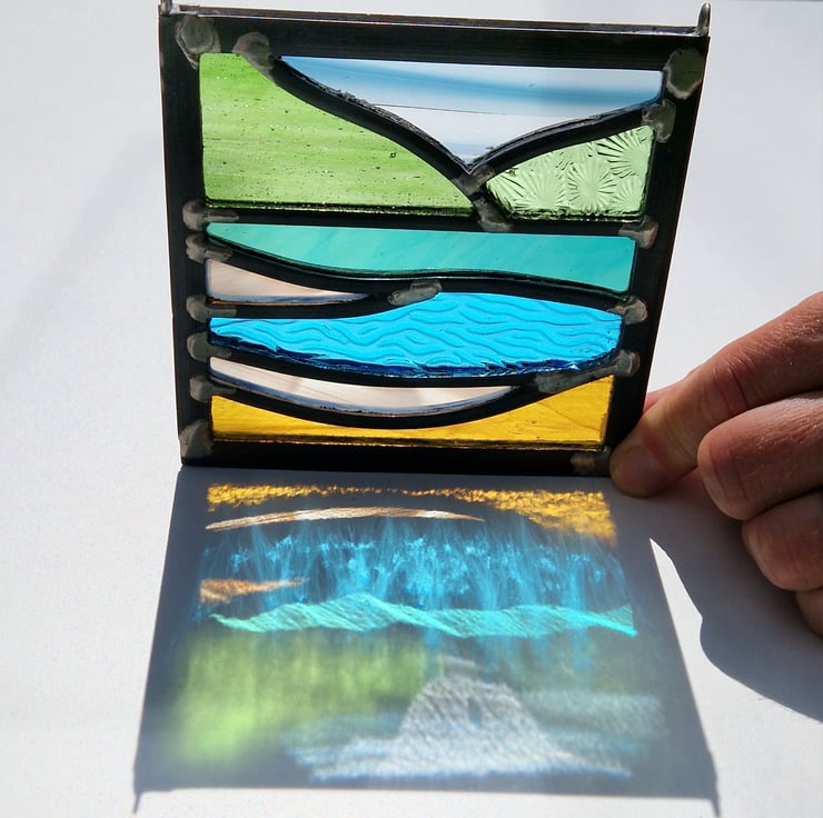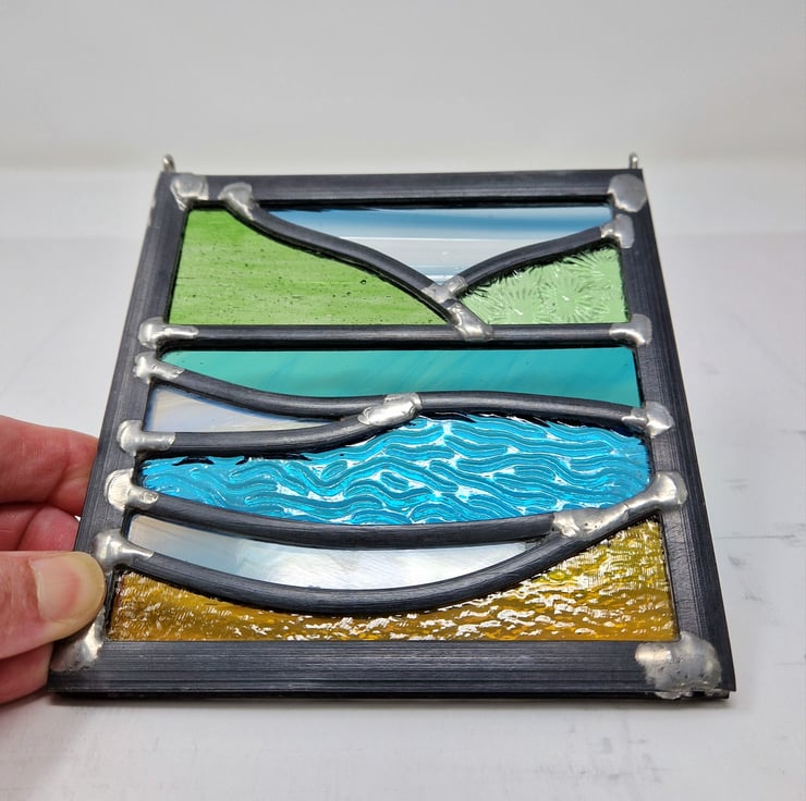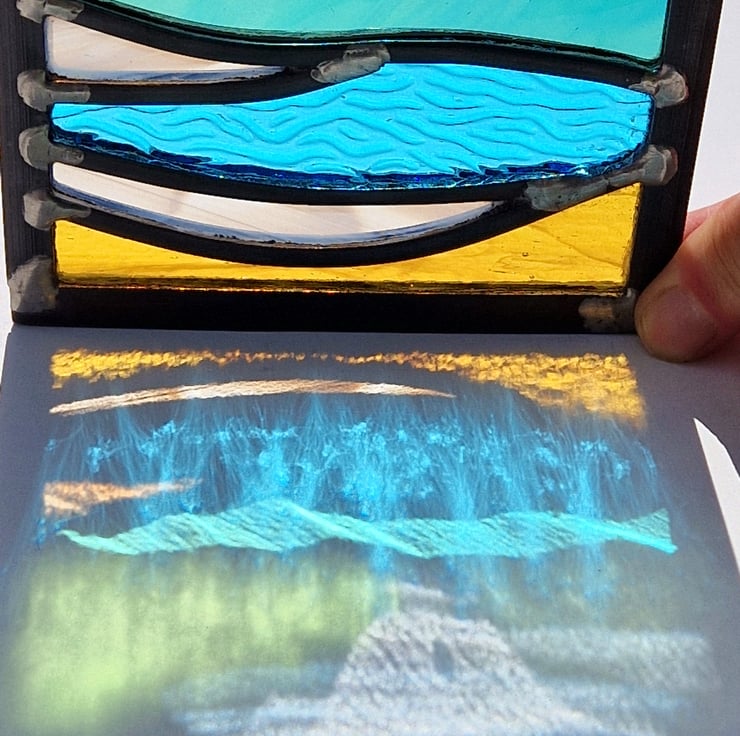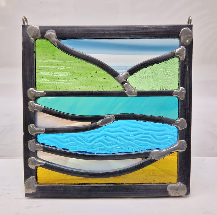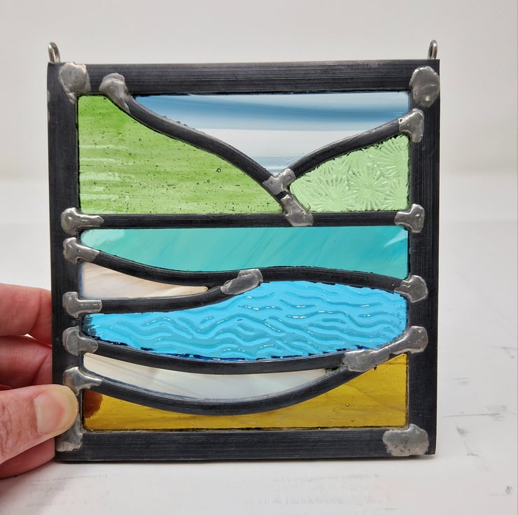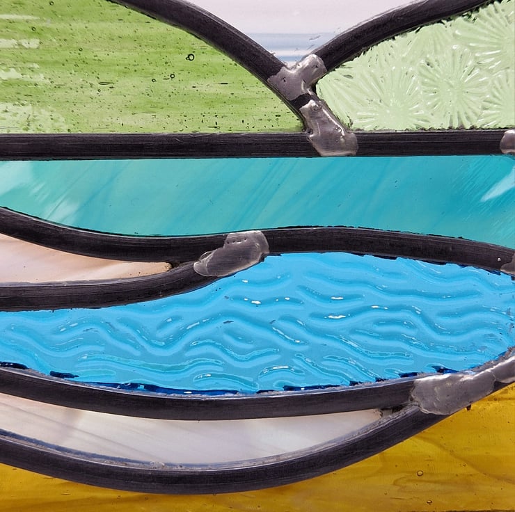 I'm a sucker for a Scottish west coast sandy beach. This is a small snapshot of time spent there. The beach is a translucent sandy amber colour of differing densities. The waves of the sea go from a beautiful rippled turquoise, then to jade. A streaky green for one island and a delicate green Florentine pattern for the other. The sky, though small is rather special. It is a now unavailable 'Baroque' glass, a lightly textured clear with a grey/blue stripe for the sky. Wispy white for the wave tops finishes the piece.