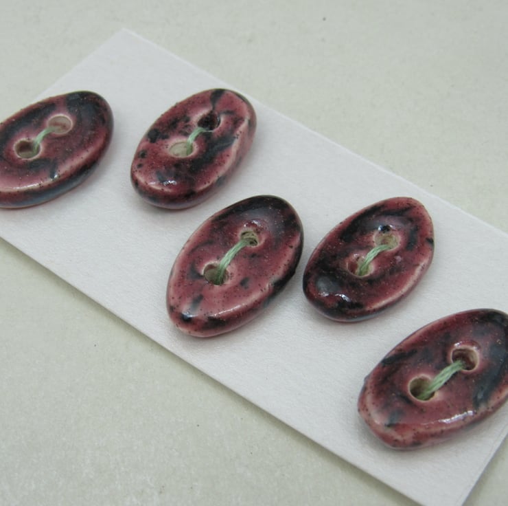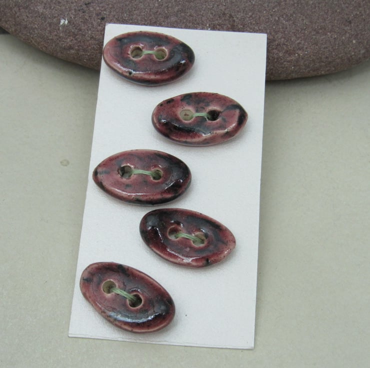 5 small oval stoneware buttons finished with a bold speckled rose red glaze