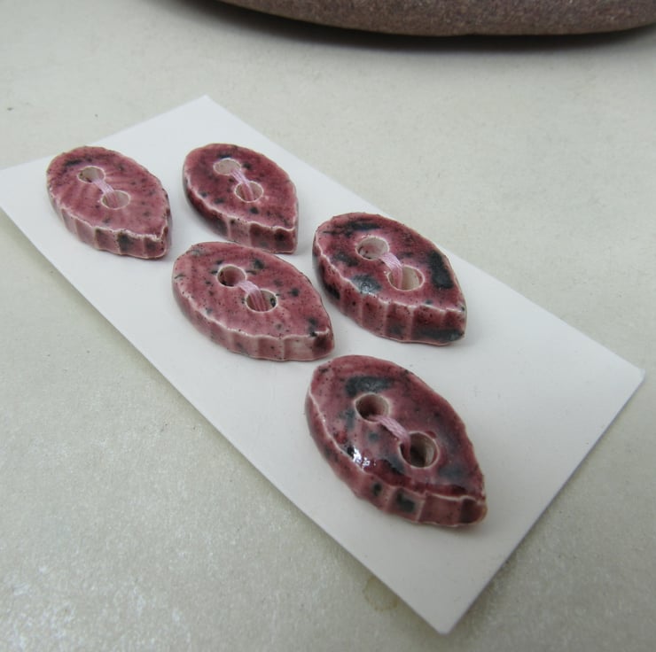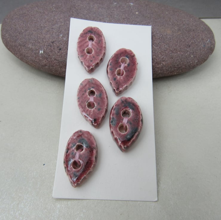 5 Small Leaf Shaped Speckled Rose Red Ceramic Buttons