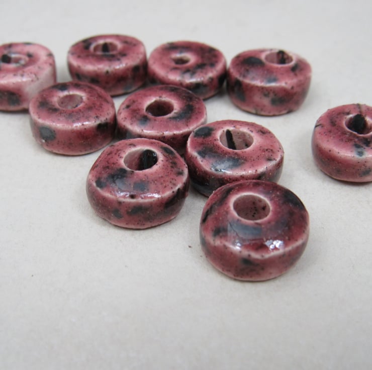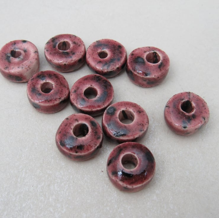 They are approx 1.3 cms (0.5") diameter, with a 3mm (0.1") hole but as they are handmade, they are not identical and not perfectly round.