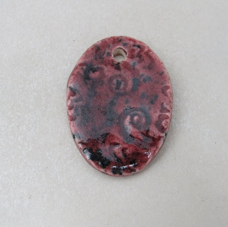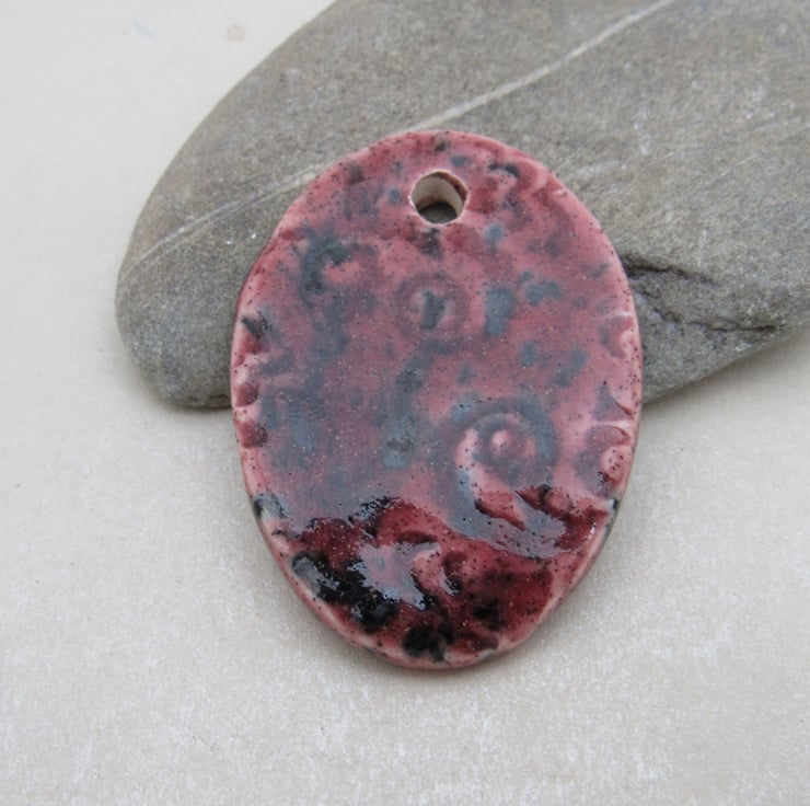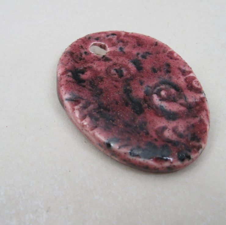 Large stoneware ceramic pendant, patterned with an embossed design of leaves and flowers, and finished with a bold speckled rose glaze.