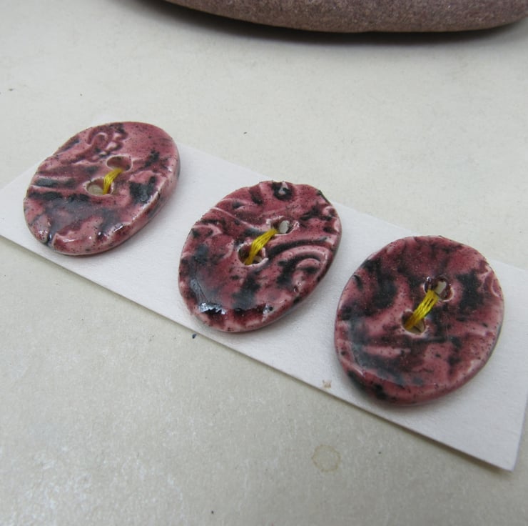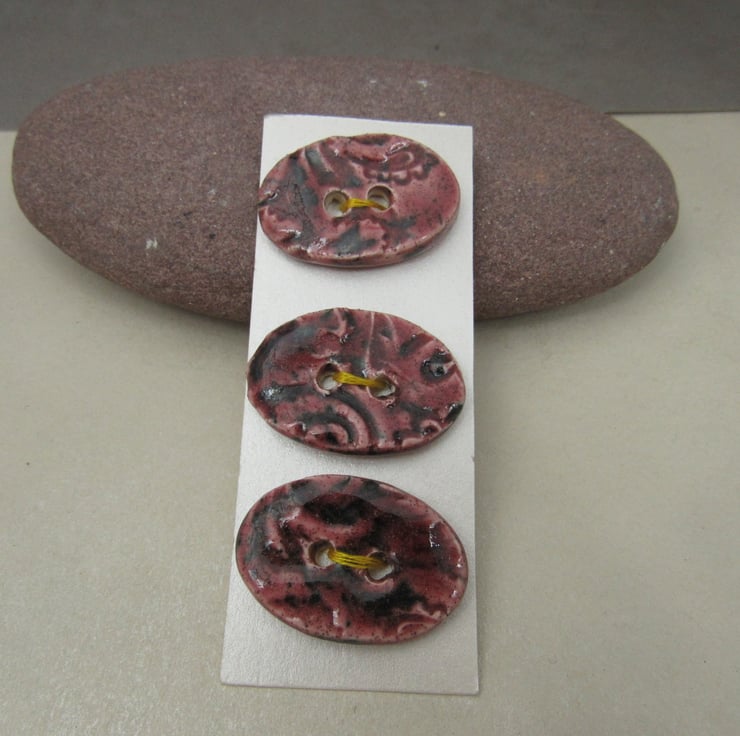 3 medium sized stoneware buttons, with a pretty brocade motif printed into the upper face. Finished with a bold speckled rose red glaze.