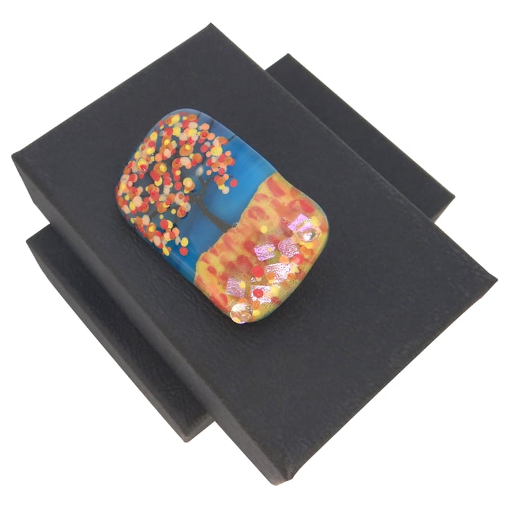 Carefully made by sandwiching a background layer of wispy blue bullseye glass with a cover of transparent glass. The tree and ground were hand painted using glassline on the blue background glass. The Autumn foliage and sparkling foreground were then layered onto the transparent layer of glass. Once fused in my kiln these different layers give the brooch a three-dimensional appearance.