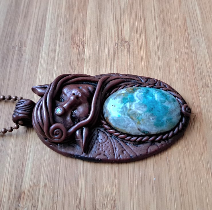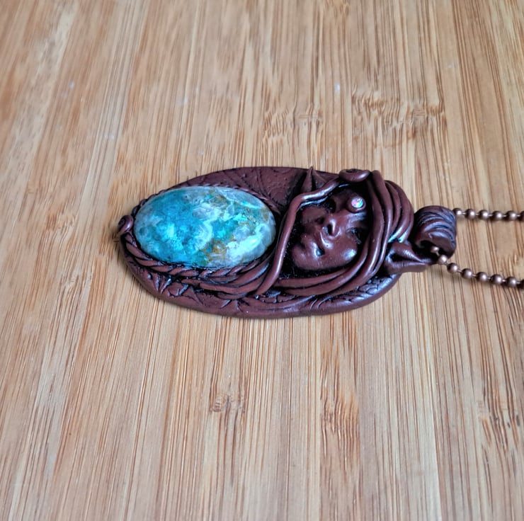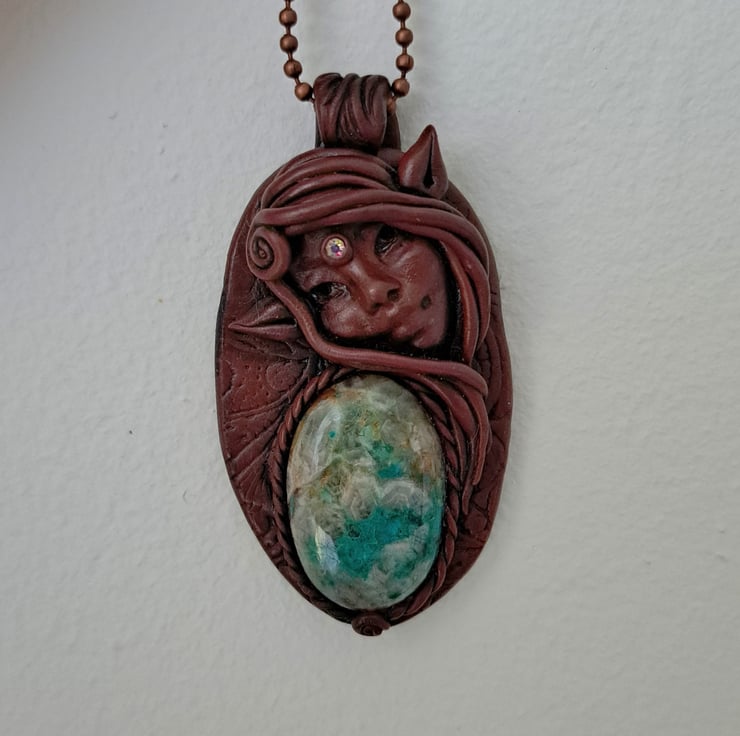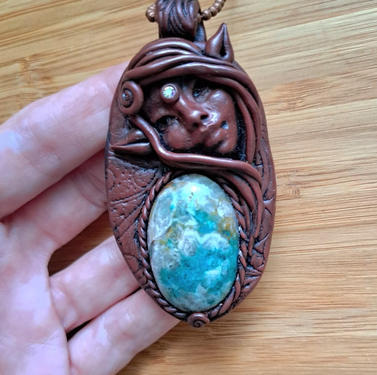 This pendant has been lovingly handcrafted with a beautiful shattuckite cabochon and brown polymer clay. It is finished with a copper ball chain that slips over the head comfortably. This can be shortened if you wish by cutting the chain to your desired length and clipping it back into the connector. All pieces are packaged in an organza bag with a small packet of fragranced incense dhoop sticks for you to enjoy.