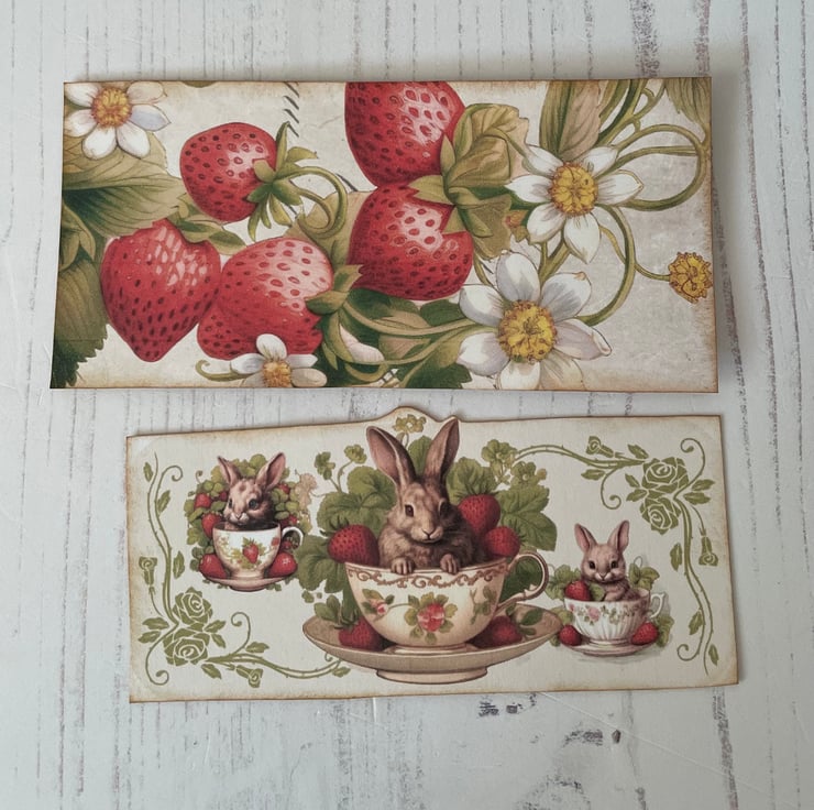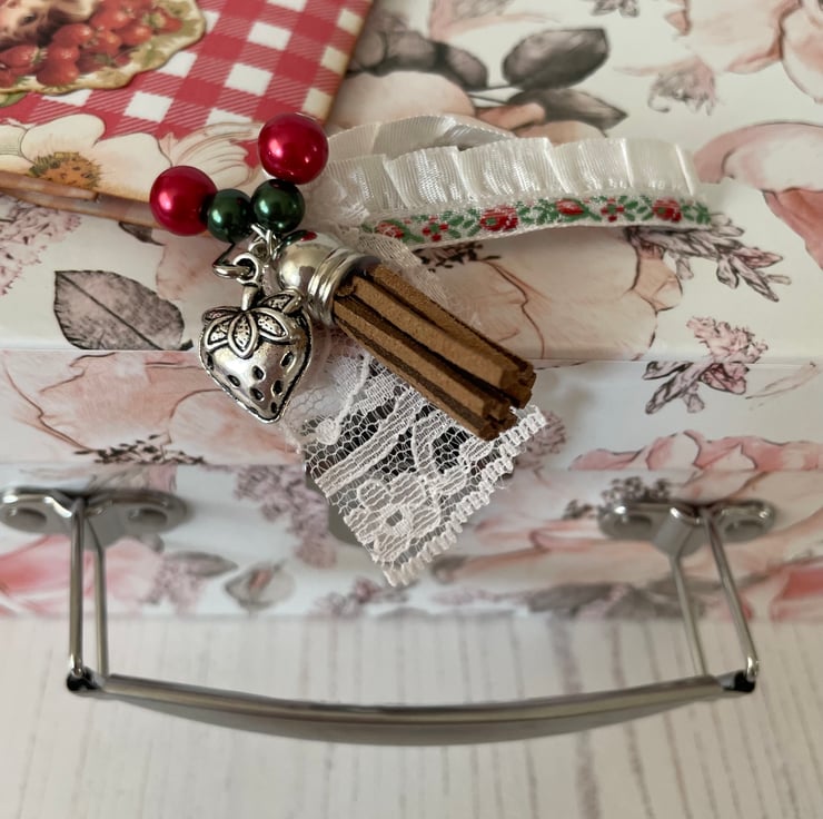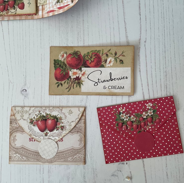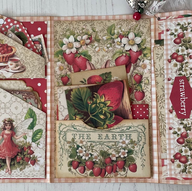 Summer, strawberries, Wimbledon and Henley go down well together. This pretty flip folio with pockets is full of summer. Red and white gingham cover with strawberry girl and basket of fruit images. Magnetic closure. Edged with gathered ribbon with red embroidered flowers. Dangle of lace, ribbon, beads and a strawberry charm. Hanging from a silver bulb pin. Two pockets with tags and journal cards on the inner cover. Middle section two pockets with tags and mini envelopes. Belly band on inside flap with 2 cards. Measures closed: 6.5” x 4”, open 6.5” x 9.5”.