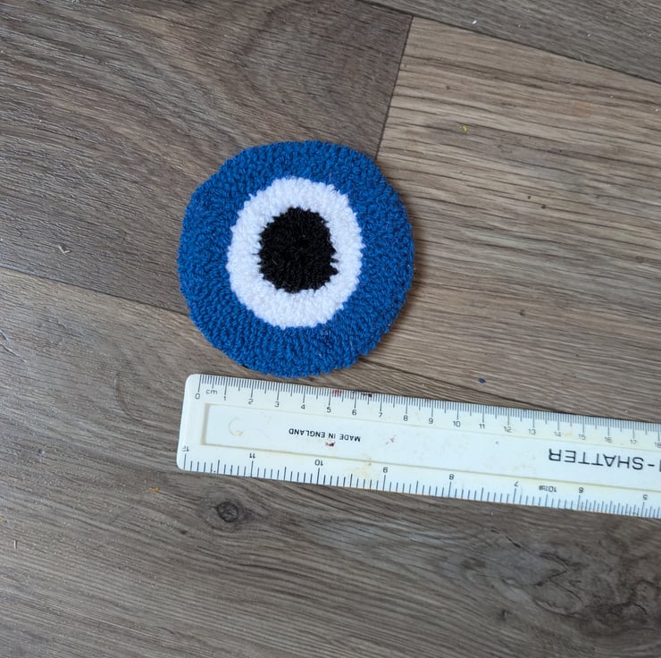 A handmade, needle punched mug rug, coaster or general decoration, made from acrylic yarn with a black felt backing.