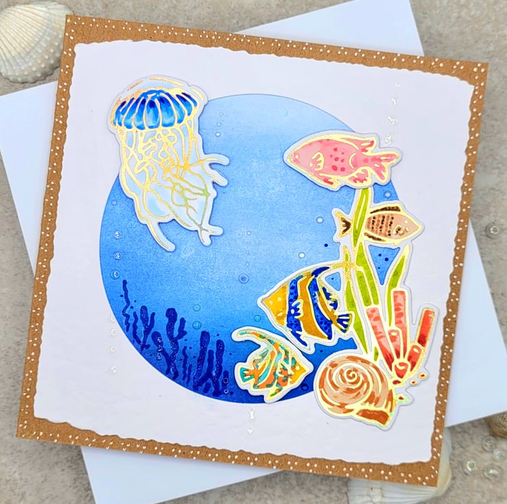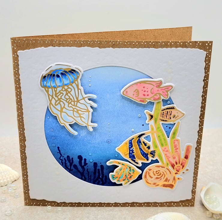 A blank card with a great under-the-sea theme, perfect for many occasions. This individually designed and detailed handmade card features sea creatures with a soft gold outline, they shine when they catch the light. All elements have been heat-foiled and coloured by hand and the sea has been inked with brushes and non-toxic inks. Tiny details such as faux water droplets and bubbles make this card unique and different. The jelly-fish and some of the fish have been popped up on slim craft foam to enhance the 3D design.