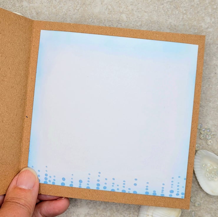 Measuring 12.5 x 12.5 cms, it will be supplied with a quality white envelope. The kraft card base is hand-cut, then decorated around the edge with white gel pen. The top layer is white hammered card with a 'torn' natural appearance and there is a 'window' to view the sea. The inside is blank and has a paper panel for writing, which I have also decorated.
