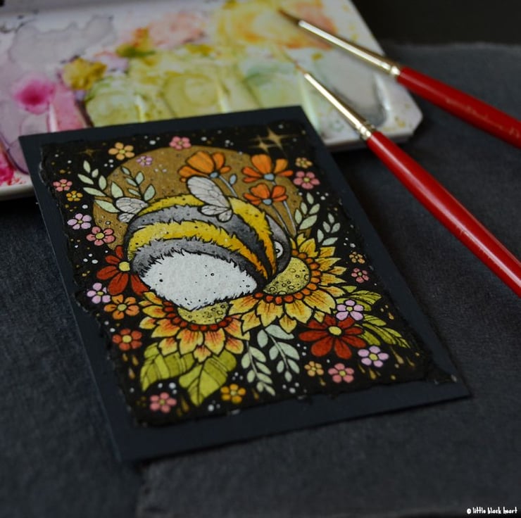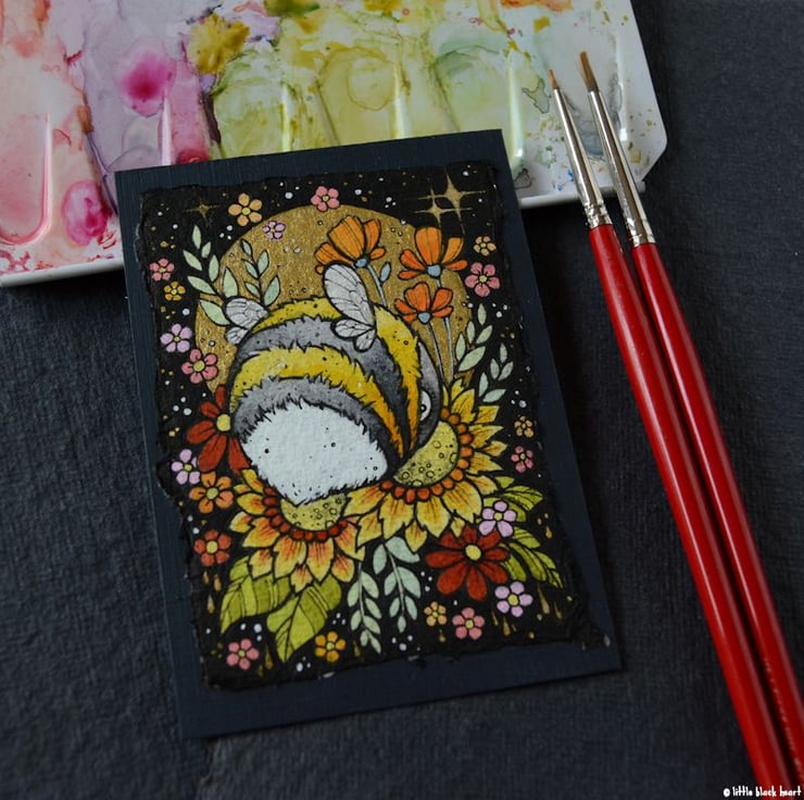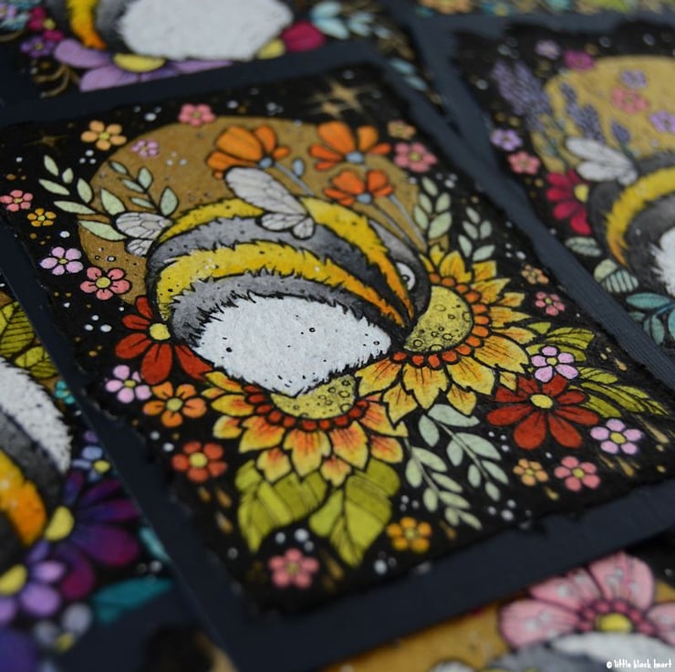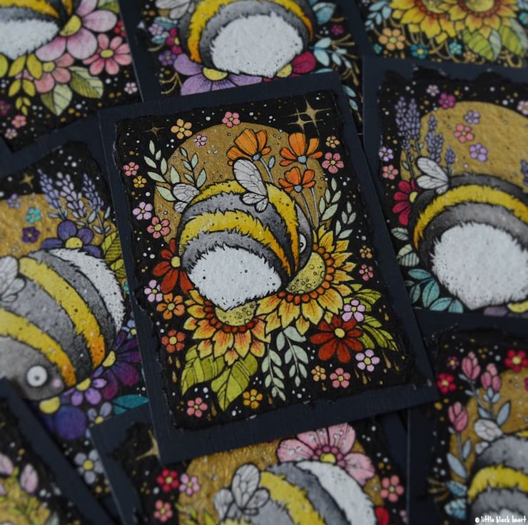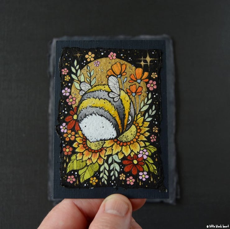 this is an original artwork, hand drawn with a tiny 0.05 nibbed pen, then coloured with ink, artists pens and watercolour paints, on khadi paper. khadi paper is handmade in india from recycled cotton rag, it has a lovely textured surface and deckled edges. i have then mounted the illustration onto a 300gsm aceo, hand painted with a paynes grey to create a dark surrounding edge/background.