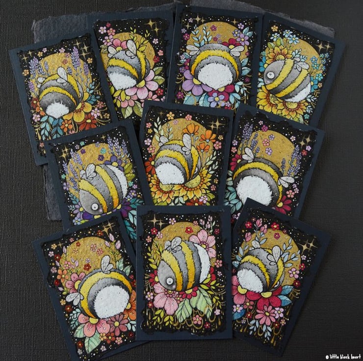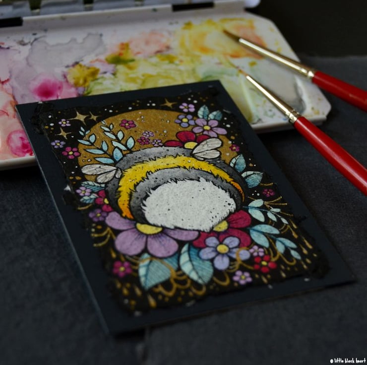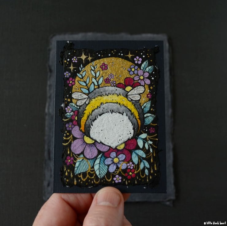 this is an original artwork, hand drawn with a tiny 0.05 nibbed pen, then coloured with ink, artists pens and watercolour paints, on khadi paper. khadi paper is handmade in india from recycled cotton rag, it has a lovely textured surface and deckled edges. i have then mounted the illustration onto a 300gsm aceo, hand painted with a paynes grey to create a dark surrounding edge/background.